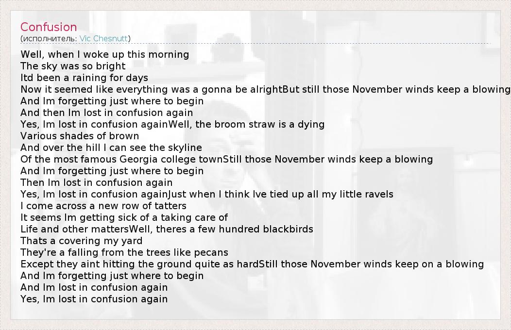 Well, when I woke up this morning The sky was so bright Itd been a raining for days Now it seemed like everything was a gonna be alrightBut still those November winds keep a blowing And Im forgetting just where to begin And then Im lost in confusion again Yes, Im lost in confusion againWell, the broom straw is a dying Various shades of brown And over the hill I can see the skyline Of the most famous Georgia college townStill those November winds keep a blowing And Im forgetting just where to begin Then Im lost in confusion again Yes, Im lost in confusion againJust when I think Ive tied up all my little ravels I come across a new row of tatters It seems Im getting sick of a taking care of Life and other mattersWell, theres a few hundred blackbirds Thats a covering my yard They're a falling from the trees like pecans Except they aint hitting the ground quite as hardStill those November winds keep on a blowing And Im forgetting just where to begin And Im lost in confusion again Yes, Im lost in confusion again