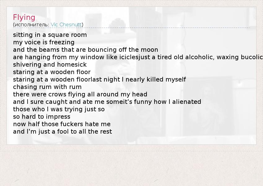 Это интересно:Рваная биография Чеснатта такова. Начал писать песни в возрасте 5 лет. В 18 был сбит машиной и стал частично парализованным. В начале 90-х его заметил певец американской рок-группы R.E.M. Майкл Стайп, спродюсировавший первые два альбома певца. Внимание широкой общественности имя Чеснатта привлекло в 1996 году, когда вышел благотворительный... продолжение