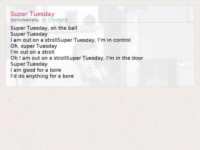 Super Tuesday, on the ball Super Tuesday I am out on a strollSuper Tuesday, I'm in control Oh, super Tuesday I'm out on a stroll Oh I am out on a strollSuper Tuesday, I'm in the door Super Tuesday I am good for a bore I'd do anything for a bore