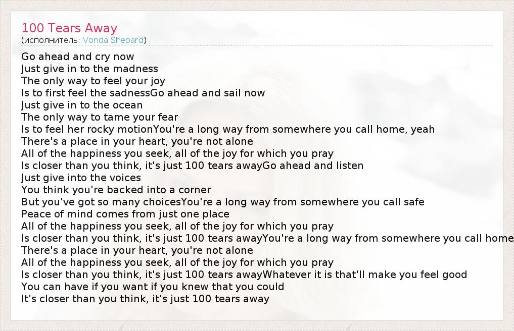 Go ahead and cry now Just give in to the madness The only way to feel your joy Is to first feel the sadnessGo ahead and sail now Just give in to the ocean The only way to tame your fear Is to feel her rocky motionYou're a long way from somewhere you call home, yeah There's a place in your heart, you're not alone All of the happiness you seek, all of the joy for which you pray Is closer than you think, it's just 100 tears awayGo ahead and listen Just give into the voices You think you're backed into a corner But you've got so many choicesYou're a long way from somewhere you call safe Peace of mind comes from just one place All of the happiness you seek, all of the joy for which you pray Is closer than you think, it's just 100 tears awayYou're a long way from somewhere you call home There's a place in your heart, you're not alone All of the happiness you seek, all of the joy for which you pray Is closer than you think, it's just 100 tears awayWhatever it is that'll make you feel good You can have if you want if you knew that you could It's closer than you think, it's just 100 tears away