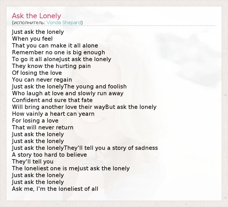 Just ask the lonely When you feel That you can make it all alone Remember no one is big enough To go it all aloneJust ask the lonely They know the hurting pain Of losing the love You can never regain Just ask the lonelyThe young and foolish Who laugh at love and slowly run away Confident and sure that fate Will bring another love their wayBut ask the lonely How vainly a heart can yearn For losing a love That will never return Just ask the lonely Just ask the lonely Just ask the lonelyThey'll tell you a story of sadness A story too hard to believe They'll tell you The loneliest one is meJust ask the lonely Just ask the lonely Just ask the lonely Ask me, I'm the loneliest of all