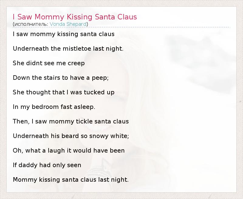 I saw mommy kissing santa claus Underneath the mistletoe last night. She didnt see me creep Down the stairs to have a peep; She thought that I was tucked up In my bedroom fast asleep. Then, I saw mommy tickle santa claus Underneath his beard so snowy white; Oh, what a laugh it would have been If daddy had only seen Mommy kissing santa claus last night.