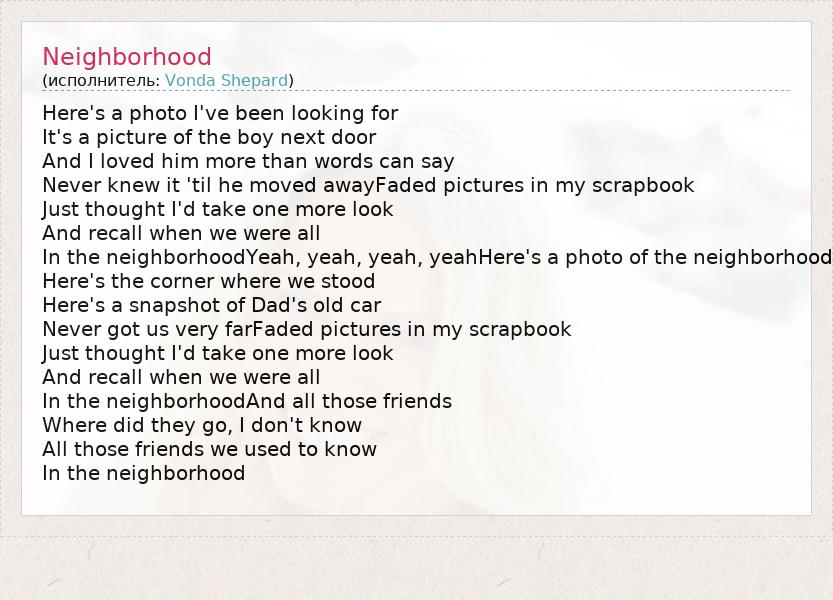 Here's a photo I've been looking for It's a picture of the boy next door And I loved him more than words can say Never knew it 'til he moved awayFaded pictures in my scrapbook Just thought I'd take one more look And recall when we were all In the neighborhoodYeah, yeah, yeah, yeahHere's a photo of the neighborhood Here's the corner where we stood Here's a snapshot of Dad's old car Never got us very farFaded pictures in my scrapbook Just thought I'd take one more look And recall when we were all In the neighborhoodAnd all those friends Where did they go, I don't know All those friends we used to know In the neighborhood