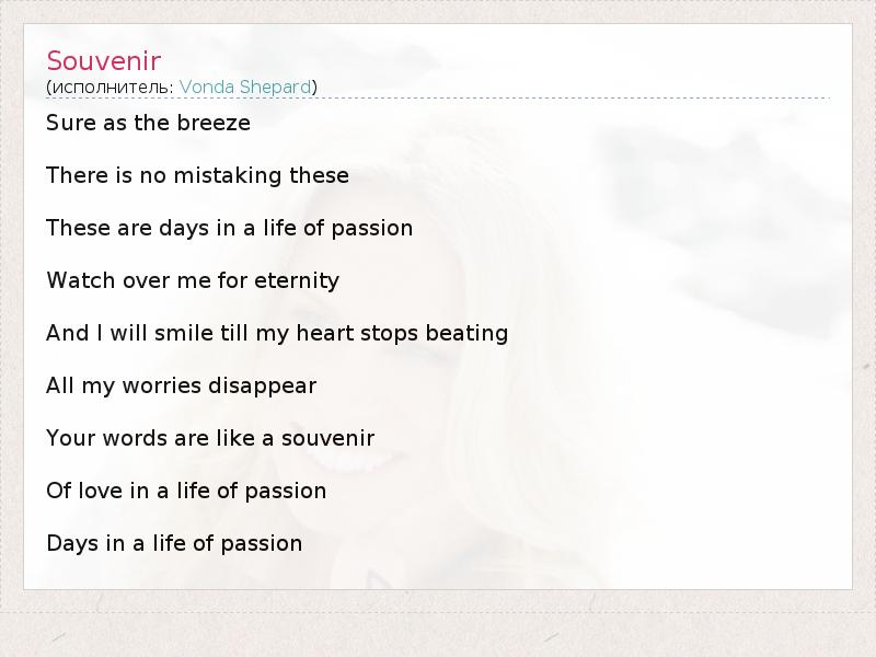 Sure as the breeze There is no mistaking these These are days in a life of passion Watch over me for eternity And I will smile till my heart stops beating All my worries disappear Your words are like a souvenir Of love in a life of passion Days in a life of passion