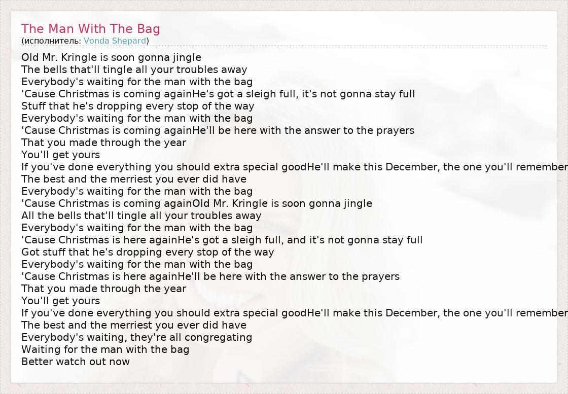 Old Mr. Kringle is soon gonna jingle The bells that'll tingle all your troubles away Everybody's waiting for the man with the bag 'Cause Christmas is coming againHe's got a sleigh full, it's not gonna stay full Stuff that he's dropping every stop of the way Everybody's waiting for the man with the bag 'Cause Christmas is coming againHe'll be here with the answer to the prayers That you made through the year You'll get yours If you've done everything you should extra special goodHe'll make this December, the one you'll remember The best and the merriest you ever did have Everybody's waiting for the man with the bag 'Cause Christmas is coming againOld Mr. Kringle is soon gonna jingle All the bells that'll tingle all your troubles away Everybody's waiting for the man with the bag 'Cause Christmas is here againHe's got a sleigh full, and it's not gonna stay full Got stuff that he's dropping every stop of the way Everybody's waiting for the man with the bag 'Cause Christmas is here againHe'll be here with the answer to the prayers That you made through the year You'll get yours If you've done everything you should extra special goodHe'll make this December, the one you'll remember The best and the merriest you ever did have Everybody's waiting, they're all congregating Waiting for the man with the bag Better watch out now