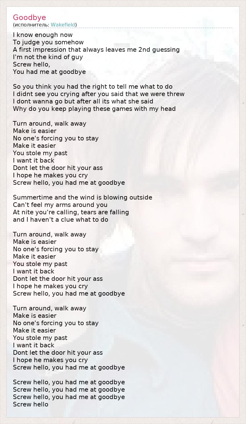 I know enough now To judge you somehow A first impression that always leaves me 2nd guessing I'm not the kind of guy Screw hello, You had me at goodbye So you think you had the right to tell me what to do I didnt see you crying after you said that we were threw I dont wanna go but after all its what she said Why do you keep playing these games with my head Turn around, walk away Make is easier No one's forcing you to stay Make it easier You stole my past I want it back Dont let the door hit your ass I hope he makes you cry Screw hello, you had me at goodbye Summertime and the wind is blowing outside Can't feel my arms around you At nite you're calling, tears are falling and I haven't a clue what to do Turn around, walk away Make is easier No one's forcing you to stay Make it easier You stole my past I want it back Dont let the door hit your ass I hope he makes you cry Screw hello, you had me at goodbye Turn around, walk away Make is easier No one's forcing you to stay Make it easier You stole my past I want it back Dont let the door hit your ass I hope he makes you cry Screw hello, you had me at goodbye Screw hello, you had me at goodbye Screw hello, you had me at goodbye Screw hello, you had me at goodbye Screw hello