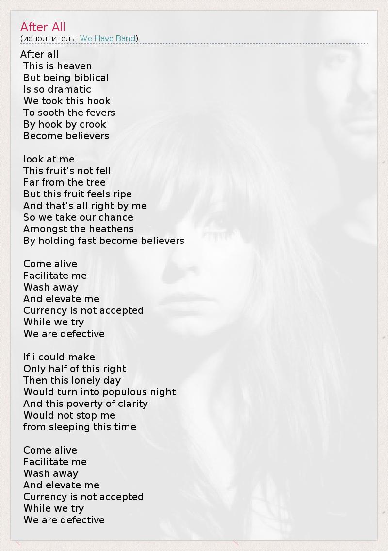 After all This is heaven But being biblical Is so dramatic We took this hook To sooth the fevers By hook by crook Become believers look at me This fruit's not fell Far from the tree But this fruit feels ripe And that's all right by me So we take our chance Amongst the heathens By holding fast become believers Come alive Facilitate me Wash away And elevate me Currency is not accepted While we try We are defective If i could make Only half of this right Then this lonely day Would turn into populous night And this poverty of clarity Would not stop me from sleeping this time Come alive Facilitate me Wash away And elevate me Currency is not accepted While we try We are defective