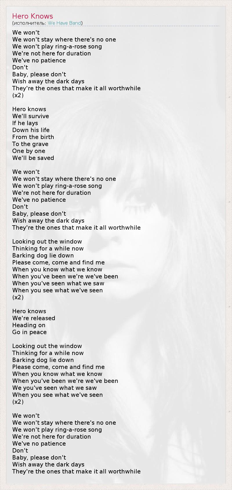 Мы, Мы не останемся там, где никого нет, Мы не будем играть детскую песенку, Мы здесь ненадолго, Мы обеспокоены. Нет, Малыш, пожалуйста, Не желай мрачных дней, Но только они, придают всему значимость. (x2) Герой знает, Мы выживем. Он Посвящает жизнь От рождения До смерти. Одного за другим Он нас спасёт. Мы, Мы не останемся там, где никого нет, Мы не будем играть детскую песенку, Мы здесь ненадолго, Мы обеспокоены. Нет, Малыш, пожалуйста, Не желай мрачных дней, Но только они, придают всему значимость. Смотришь в окно, И тем временем думаешь. Собака лает и лежит. Пожалуйста, приди, приди и найди меня. Когда ты узнаешь, что мы знаем, Когда ты станешь, кем мы стали, Когда ты увидишь, что мы видели, Тогда ты поймёшь, что поняли мы. (x2) Герой знает, Он нас выпустит. Вперёд, Иди с миром. Смотришь в окно, И тем временем думаешь. Собака лает и лежит. Пожалуйста, приди, приди и найди меня. Когда ты узнаешь, что мы знаем, Когда ты станешь, кем мы стали, Когда ты увидишь, что мы видели, Тогда ты поймёшь, что поняли мы. (x2) Мы, Мы не останемся там, где никого нет, Мы не будем играть детскую песенку, Мы здесь ненадолго, Мы обеспокоены. Нет, Малыш, пожалуйста, Не желай мрачных дней, Но только они, придают всему значимость. (c)TheMostKnown @relyric.ru