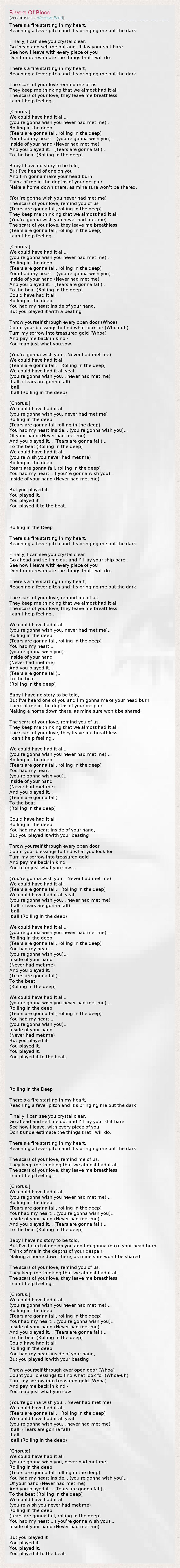 There's a fire starting in my heart, Reaching a fever pitch and it's bringing me out the dark Finally, I can see you crystal clear. Go 'head and sell me out and I'll lay your shit bare. See how I leave with every piece of you Don't underestimate the things that I will do. There's a fire starting in my heart, Reaching a fever pitch and it's bringing me out the dark The scars of your love remind me of us. They keep me thinking that we almost had it all The scars of your love, they leave me breathless I can't help feeling... [Chorus:] We could have had it all... (you're gonna wish you never had met me)... Rolling in the deep (Tears are gonna fall, rolling in the deep) Your had my heart... (you're gonna wish you)... Inside of your hand (Never had met me) And you played it... (Tears are gonna fall)... To the beat (Rolling in the deep) Baby I have no story to be told, But I've heard of one on you And I'm gonna make your head burn. Think of me in the depths of your despair. Make a home down there, as mine sure won't be shared. (You're gonna wish you never had met me) The scars of your love, remind you of us. (Tears are gonna fall, rolling in the deep) They keep me thinking that we almost had it all (You're gonna wish you never had met me) The scars of your love, they leave me breathless (Tears are gonna fall, rolling in the deep) I can't help feeling... [Chorus:] We could have had it all... (you're gonna wish you never had met me)... Rolling in the deep (Tears are gonna fall, rolling in the deep) Your had my heart... (you're gonna wish you)... Inside of your hand (Never had met me) And you played it... (Tears are gonna fall)... To the beat (Rolling in the deep) Could have had it all Rolling in the deep. You had my heart inside of your hand, But you played it with a beating Throw yourself through every open door (Whoa) Count your blessings to find what look for (Whoa-uh) Turn my sorrow into treasured gold (Whoa) And pay me back in kind - You reap just what you sow. (You're gonna wish you... Never had met me) We could have had it all (Tears are gonna fall... Rolling in the deep) We could have had it all yeah (you're gonna wish you... never had met me) It all. (Tears are gonna fall) It all It all (Rolling in the deep) [Chorus:] We could have had it all (you're gonna wish you, never had met me) Rolling in the deep (Tears are gonna fall rolling in the deep) You had my heart inside... (you're gonna wish you)... Of your hand (Never had met me) And you played it... (Tears are gonna fall)... To the beat (Rolling in the deep) We could have had it all (you're wish you never had met me) Rolling in the deep (tears are gonna fall, rolling in the deep) You had my heart... ( you're gonna wish you)... Inside of your hand (Never had met me) But you played it You played it. You played it. You played it to the beat. Rolling in the Deep There's a fire starting in my heart, Reaching a fever pitch and it's bringing me out the dark Finally, I can see you crystal clear. Go ahead and sell me out and I'll lay your ship bare. See how I leave with every piece of you Don't underestimate the things that I will do. There's a fire starting in my heart, Reaching a fever pitch and it's bringing me out the dark The scars of your love, remind me of us. They keep me thinking that we almost had it all The scars of your love, they leave me breathless I can't help feeling... We could have had it all... (you're gonna wish you, never had met me)... Rolling in the deep (Tears are gonna fall, rolling in the deep) You had my heart... (you're gonna wish you)... Inside of your hand (Never had met me) And you played it... (Tears are gonna fall)... To the beat (Rolling in the deep) Baby I have no story to be told, But I've heard one of you and I'm gonna make your head burn. Think of me in the depths of your despair. Making a home down there, as mine sure won't be shared. The scars of your love, remind you of us. They keep me thinking that we almost had it all The scars of your love, they leave me breathless I can't help feeling... We could have had it all... (you're gonna wish you never had met me)... Rolling in the deep (Tears are gonna fall, rolling in the deep) You had my heart... (you're gonna wish you)... Inside of your hand (Never had met me) And you played it... (Tears are gonna fall)... To the beat (Rolling in the deep) Could have had it all Rolling in the deep. You had my heart inside of your hand, But you played it with your beating Throw yourself through every open door Count your blessings to find what you look for Turn my sorrow into treasured gold And pay me back in kind You reap just what you sow... (You're gonna wish you... Never had met me) We could have had it all (Tears are gonna fall... Rolling in the deep) We could have had it all yeah (you're gonna wish you... never had met me) It all. (Tears are gonna fall) It all It all (Rolling in the deep) We could have had it all... (you're gonna wish you never had met me)... Rolling in the deep (Tears are gonna fall, rolling in the deep) You had my heart... (you're gonna wish you)... Inside of your hand (Never had met me) And you played it... (Tears are gonna fall)... To the beat (Rolling in the deep) We could have had it all... (you're gonna wish you never had met me)... Rolling in the deep (Tears are gonna fall, rolling in the deep) You had my heart... (you're gonna wish you)... Inside of your hand (Never had met me) But you played it You played it. You played it. You played it to the beat. Rolling in the Deep There's a fire starting in my heart, Reaching a fever pitch and it's bringing me out the dark Finally, I can see you crystal clear. Go ahead and sell me out and I'll lay your shit bare. See how I leave, with every piece of you Don't underestimate the things that I will do. There's a fire starting in my heart, Reaching a fever pitch and it's bringing me out the dark The scars of your love, remind me of us. They keep me thinking that we almost had it all The scars of your love