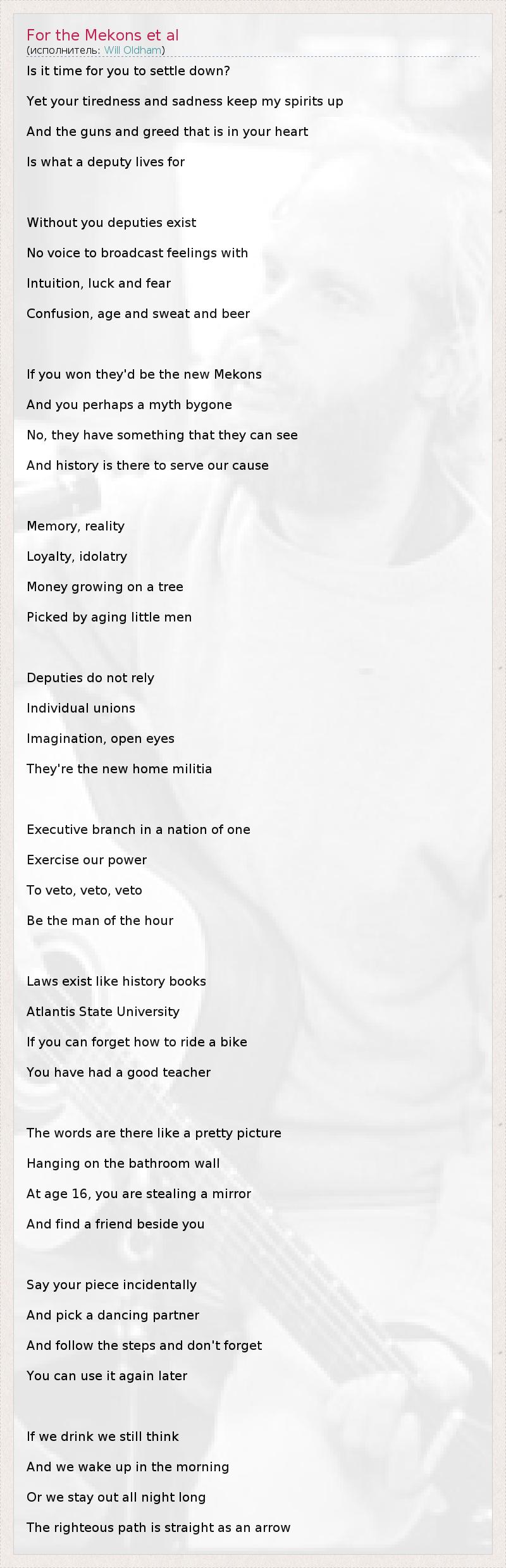 Is it time for you to settle down? Yet your tiredness and sadness keep my spirits up And the guns and greed that is in your heart Is what a deputy lives for Without you deputies exist No voice to broadcast feelings with Intuition, luck and fear Confusion, age and sweat and beer If you won they'd be the new Mekons And you perhaps a myth bygone No, they have something that they can see And history is there to serve our cause Memory, reality Loyalty, idolatry Money growing on a tree Picked by aging little men Deputies do not rely Individual unions Imagination, open eyes They're the new home militia Executive branch in a nation of one Exercise our power To veto, veto, veto Be the man of the hour Laws exist like history books Atlantis State University If you can forget how to ride a bike You have had a good teacher The words are there like a pretty picture Hanging on the bathroom wall At age 16, you are stealing a mirror And find a friend beside you Say your piece incidentally And pick a dancing partner And follow the steps and don't forget You can use it again later If we drink we still think And we wake up in the morning Or we stay out all night long The righteous path is straight as an arrow