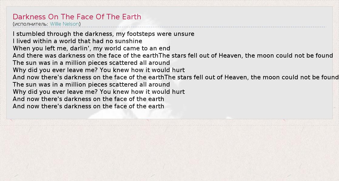 I stumbled through the darkness, my footsteps were unsure I lived within a world that had no sunshine When you left me, darlin', my world came to an end And there was darkness on the face of the earthThe stars fell out of Heaven, the moon could not be found The sun was in a million pieces scattered all around Why did you ever leave me? You knew how it would hurt And now there's darkness on the face of the earthThe stars fell out of Heaven, the moon could not be found The sun was in a million pieces scattered all around Why did you ever leave me? You knew how it would hurt And now there's darkness on the face of the earth And now there's darkness on the face of the earth