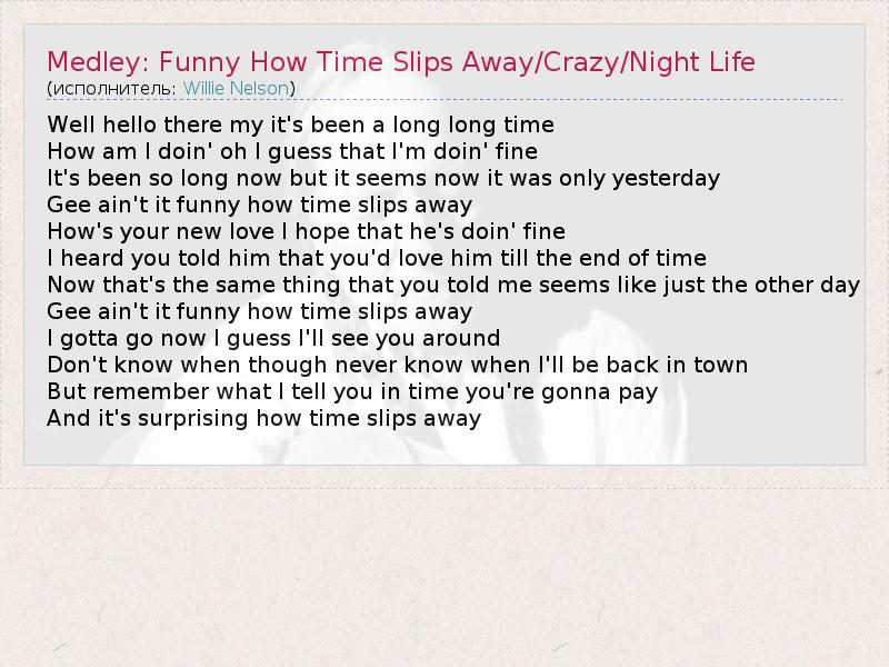 А как ты думаешь, о чем песня "Medley: Funny How Time Slips Away/Crazy/Night Life" ?