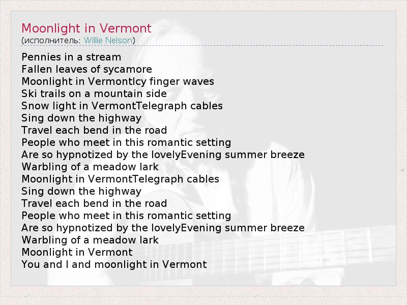 Pennies in a stream Fallen leaves of sycamore Moonlight in VermontIcy finger waves Ski trails on a mountain side Snow light in VermontTelegraph cables Sing down the highway Travel each bend in the road People who meet in this romantic setting Are so hypnotized by the lovelyEvening summer breeze Warbling of a meadow lark Moonlight in VermontTelegraph cables Sing down the highway Travel each bend in the road People who meet in this romantic setting Are so hypnotized by the lovelyEvening summer breeze Warbling of a meadow lark Moonlight in Vermont You and I and moonlight in Vermont