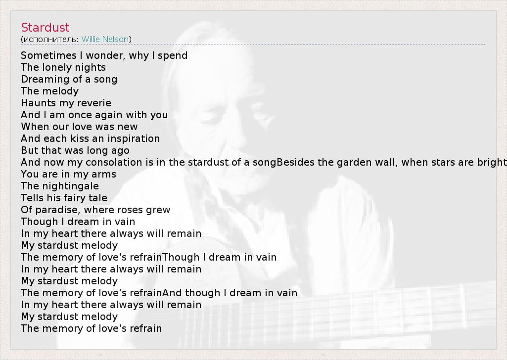 Это интересно:Willie Nelson, полное имя William Hugh Nelson, род. 30 апреля 1933 года) — один из столпов музыки кантри ХХ века, обладатель множества наград, в том числе премий «Грэмми» в категориях «Музыкальная легенда» (1990) и «За жизненные достижения» (1999).Отсчёт музыкальной карьеры Нельсона начинается с 1956 года. На первых порах его собственные записи отвергались боссами звукозаписывающих компаний по причине немодного,... продолжение