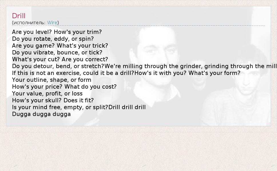 Are you level? How's your trim? Do you rotate, eddy, or spin? Are you game? What's your trick? Do you vibrate, bounce, or tick? What's your cut? Are you correct? Do you detour, bend, or stretch?We're milling through the grinder, grinding through the mill If this is not an exercise, could it be a drill?How's it with you? What's your form? Your outline, shape, or form How's your price? What do you cost? Your value, profit, or loss How's your skull? Does it fit? Is your mind free, empty, or split?Drill drill drill Dugga dugga dugga