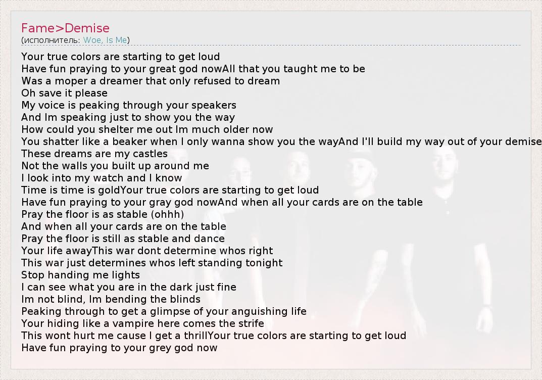 Your true colors are starting to get loud Have fun praying to your great god nowAll that you taught me to be Was a moper a dreamer that only refused to dream Oh save it please My voice is peaking through your speakers And Im speaking just to show you the way How could you shelter me out Im much older now You shatter like a beaker when I only wanna show you the wayAnd I'll build my way out of your demise These dreams are my castles Not the walls you built up around me I look into my watch and I know Time is time is goldYour true colors are starting to get loud Have fun praying to your gray god nowAnd when all your cards are on the table Pray the floor is as stable (ohhh) And when all your cards are on the table Pray the floor is still as stable and dance Your life awayThis war dont determine whos right This war just determines whos left standing tonight Stop handing me lights I can see what you are in the dark just fine Im not blind, Im bending the blinds Peaking through to get a glimpse of your anguishing life Your hiding like a vampire here comes the strife This wont hurt me cause I get a thrillYour true colors are starting to get loud Have fun praying to your grey god now