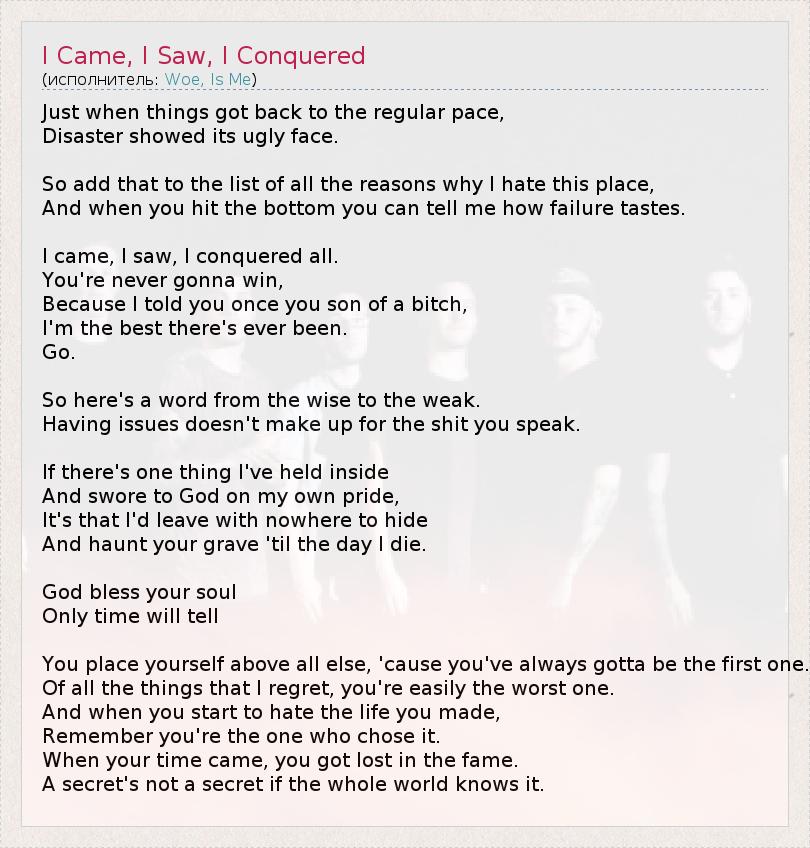 А как ты думаешь, о чем песня "I Came, I Saw, I Conquered" ?