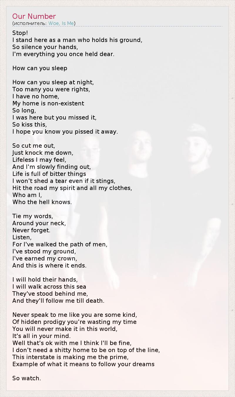 Stop! I stand here as a man who holds his ground, So silence your hands, I'm everything you once held dear. How can you sleep How can you sleep at night, Too many you were rights, I have no home, My home is non-existent So long, I was here but you missed it, So kiss this, I hope you know you pissed it away. So cut me out, Just knock me down, Lifeless I may feel, And I'm slowly finding out, Life is full of bitter things I won't shed a tear even if it stings, Hit the road my spirit and all my clothes, Who am I, Who the hell knows. Tie my words, Around your neck, Never forget. Listen, For I've walked the path of men, I've stood my ground, I've earned my crown, And this is where it ends. I will hold their hands, I will walk across this sea They've stood behind me, And they'll follow me till death. Never speak to me like you are some kind, Of hidden prodigy you're wasting my time You will never make it in this world, It's all in your mind. Well that's ok with me I think I'll be fine, I don't need a shitty home to be on top of the line, This interstate is making me the prime, Example of what it means to follow your dreams So watch.