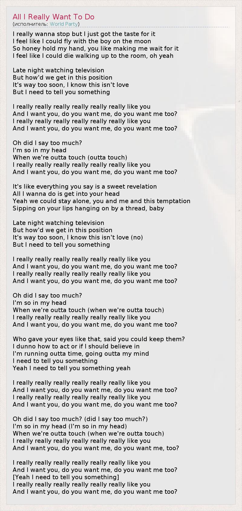 Я очень хочу остановиться, но у меня просто зависимость. Я чувствую, что могла бы полететь с этим парнем на Луну. Так возьми меня за руку, милый, ты заставляешь меня ждать. Я просто не могу дождаться, пока дойду до комнаты, о, да. Мы смотрели телевизор допоздна, Но как мы оказались в этой позе? Слишком быстро. Я знаю, это не любовь, Но мне нужно сказать тебе кое-что. Ты мне очень-очень-очень-очень-очень-очень нравишься. И я хочу тебя. А ты хочешь меня? Ты хочешь меня? Ты мне очень-очень-очень-очень-очень-очень нравишься. И я хочу тебя. А ты хочешь меня? Ты хочешь меня? О, может, я сказала лишнее? Я сама не своя, Когда мы в разлуке (в разлуке) Ты мне очень-очень-очень-очень-очень-очень нравишься. И я хочу тебя. А ты хочешь меня? Ты хочешь меня? Всё, что ты говоришь, для меня словно откровение. Всё, что я хочу, – это засесть у тебя в голове. Да, мы могли бы остаться наедине: ты, я и это искушение, Упиваясь твоими губами, балансируя на грани, малыш. Мы смотрели телевизор допоздна, Но как мы оказались в этой позе? Слишком быстро. Я знаю, это не любовь (нет), Но мне нужно сказать тебе кое-что. Ты мне очень-очень-очень-очень-очень-очень нравишься. И я хочу тебя. А ты хочешь меня? Ты хочешь меня? Ты мне очень-очень-очень-очень-очень-очень нравишься. И я хочу тебя. А ты хочешь меня? Ты хочешь меня? О, может, я сказала лишнее? Я сама не своя, Когда мы в разлуке (когда мы в разлуке) Ты мне очень-очень-очень-очень-очень-очень нравишься. И я хочу тебя. А ты хочешь меня? Ты тоже хочешь меня? Откуда у тебя такие глаза? Кто одарил тебя ими? Я не знаю, что мне делать: верить или нет? Я ничего не успеваю, я схожу с ума. Мне нужно сказать тебе кое-что. Да, мне нужно сказать тебе кое-что, да... Ты мне очень-очень-очень-очень-очень-очень нравишься. И я хочу тебя. А ты хочешь меня? Ты хочешь меня? Ты мне очень-очень-очень-очень-очень-очень нравишься. И я хочу тебя. А ты хочешь меня? Ты хочешь меня? О, может, я сказала лишнее? (я сказала лишнее?) Я сама не своя (я сама не своя) Когда мы в разлуке (когда мы в разлуке) Ты мне очень-очень-очень-очень-очень-очень нравишься. И я хочу тебя. А ты хочешь меня? Ты хочешь меня? Ты мне очень-очень-очень-очень-очень-очень нравишься. И я хочу тебя. А ты хочешь меня? Ты хочешь меня? [Да, мне нужно сказать тебе кое-что] Ты мне очень-очень-очень-очень-очень-очень нравишься. И я хочу тебя. А ты хочешь меня? Ты хочешь меня?