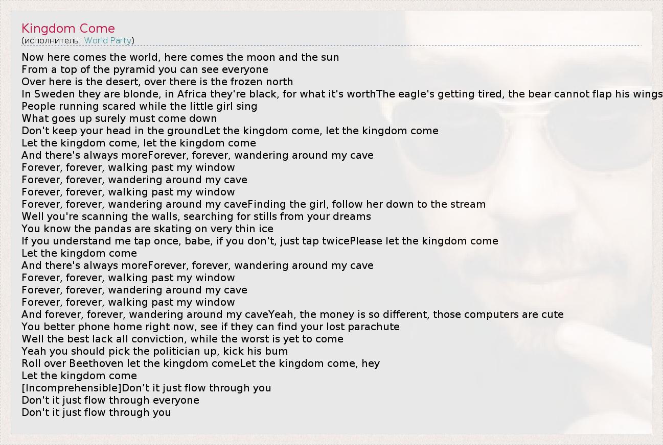 Now here comes the world, here comes the moon and the sun From a top of the pyramid you can see everyone Over here is the desert, over there is the frozen north In Sweden they are blonde, in Africa they're black, for what it's worthThe eagle's getting tired, the bear cannot flap his wings People running scared while the little girl sing What goes up surely must come down Don't keep your head in the groundLet the kingdom come, let the kingdom come Let the kingdom come, let the kingdom come And there's always moreForever, forever, wandering around my cave Forever, forever, walking past my window Forever, forever, wandering around my cave Forever, forever, walking past my window Forever, forever, wandering around my caveFinding the girl, follow her down to the stream Well you're scanning the walls, searching for stills from your dreams You know the pandas are skating on very thin ice If you understand me tap once, babe, if you don't, just tap twicePlease let the kingdom come Let the kingdom come And there's always moreForever, forever, wandering around my cave Forever, forever, walking past my window Forever, forever, wandering around my cave Forever, forever, walking past my window And forever, forever, wandering around my caveYeah, the money is so different, those computers are cute You better phone home right now, see if they can find your lost parachute Well the best lack all conviction, while the worst is yet to come Yeah you should pick the politician up, kick his bum Roll over Beethoven let the kingdom comeLet the kingdom come, hey Let the kingdom come [Incomprehensible]Don't it just flow through you Don't it just flow through everyone Don't it just flow through you