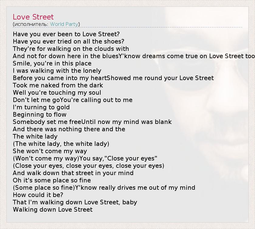 Have you ever been to Love Street? Have you ever tried on all the shoes? They're for walking on the clouds with And not for down here in the bluesY'know dreams come true on Love Street too Smile, you're in this place I was walking with the lonely Before you came into my heartShowed me round your Love Street Took me naked from the dark Well you're touching my soul Don't let me goYou're calling out to me I'm turning to gold Beginning to flow Somebody set me freeUntil now my mind was blank And there was nothing there and the The white lady (The white lady, the white lady) She won't come my way (Won't come my way)You say,"Close your eyes" (Close your eyes, close your eyes, close your eyes) And walk down that street in your mind Oh it's some place so fine (Some place so fine)Y'know really drives me out of my mind How could it be? That I'm walking down Love Street, baby Walking down Love Street