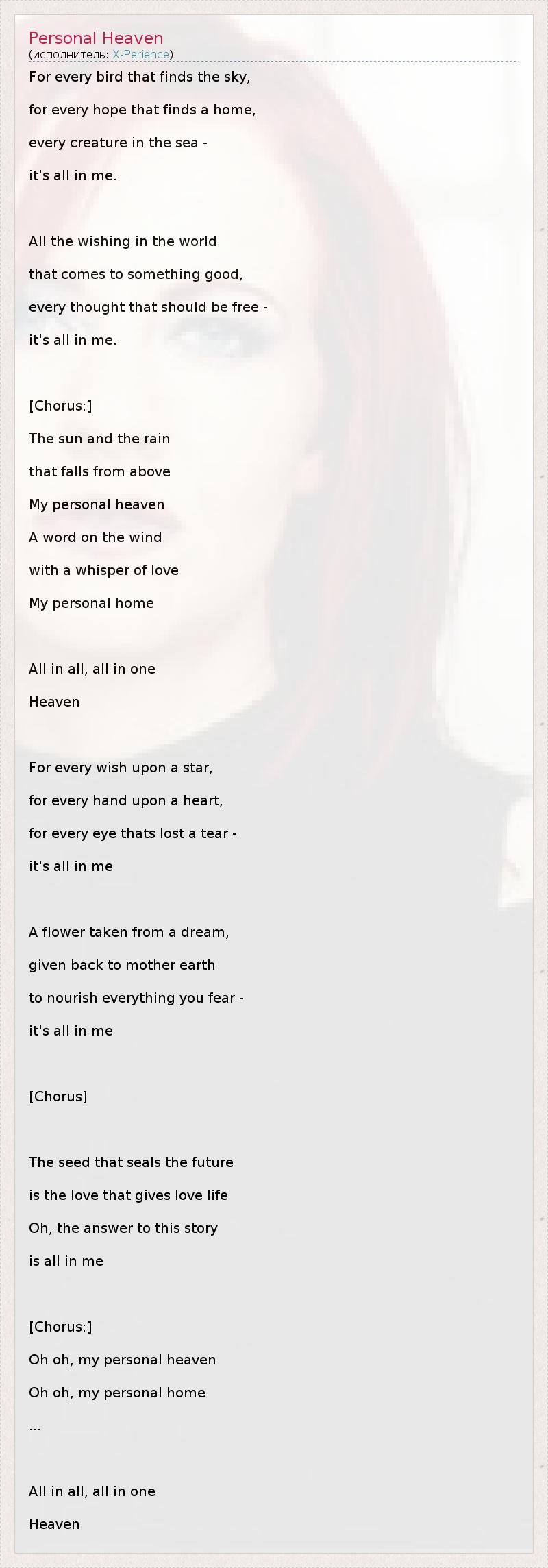 For every bird that finds the sky, for every hope that finds a home, every creature in the sea - it's all in me. All the wishing in the world that comes to something good, every thought that should be free - it's all in me. [Chorus:] The sun and the rain that falls from above My personal heaven A word on the wind with a whisper of love My personal home All in all, all in one Heaven For every wish upon a star, for every hand upon a heart, for every eye thats lost a tear - it's all in me A flower taken from a dream, given back to mother earth to nourish everything you fear - it's all in me [Chorus] The seed that seals the future is the love that gives love life Oh, the answer to this story is all in me [Chorus:] Oh oh, my personal heaven Oh oh, my personal home ... All in all, all in one Heaven