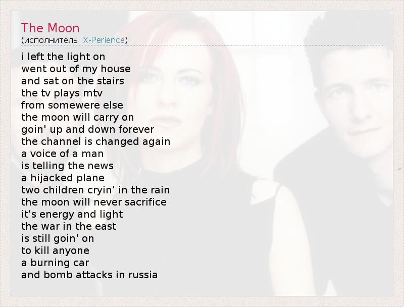 i left the light on went out of my house and sat on the stairs the tv plays mtv from somewere else the moon will carry on goin' up and down forever the channel is changed again a voice of a man is telling the news a hijacked plane two children cryin' in the rain the moon will never sacrifice it's energy and light the war in the east is still goin' on to kill anyone a burning car and bomb attacks in russia