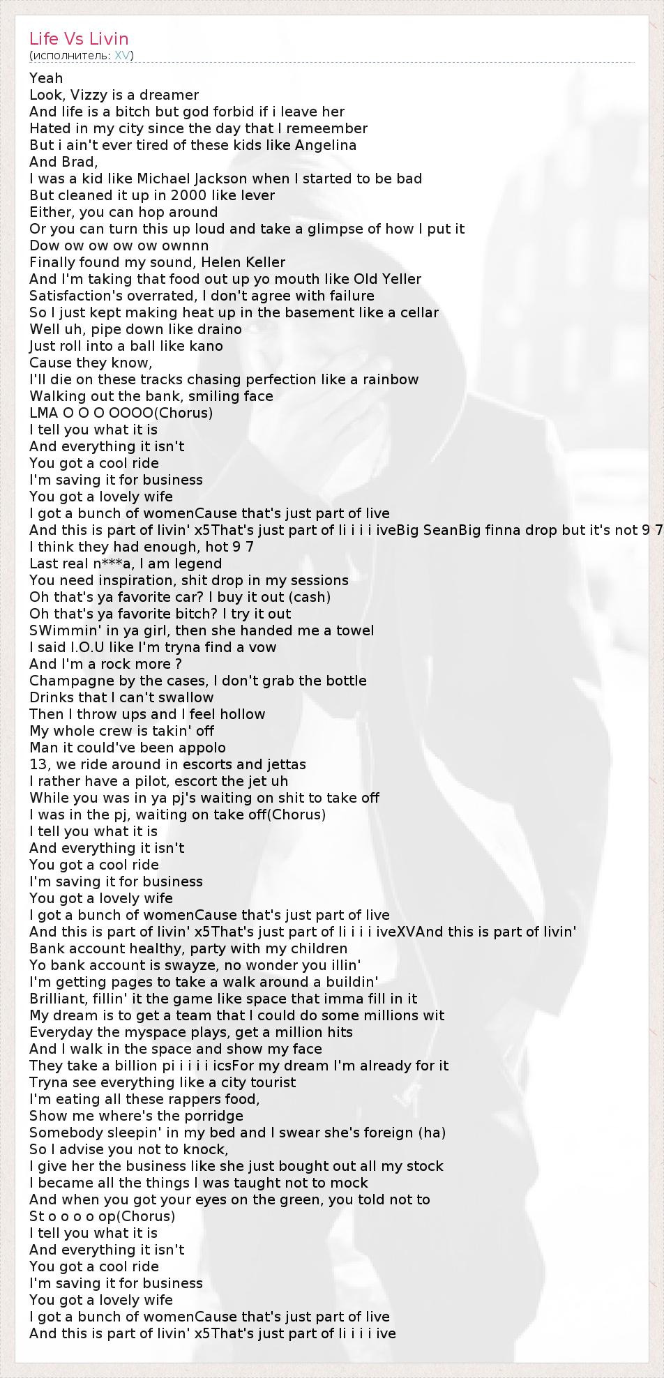 Yeah Look, Vizzy is a dreamer And life is a bitch but god forbid if i leave her Hated in my city since the day that I remeember But i ain't ever tired of these kids like Angelina And Brad, I was a kid like Michael Jackson when I started to be bad But cleaned it up in 2000 like lever Either, you can hop around Or you can turn this up loud and take a glimpse of how I put it Dow ow ow ow ow ownnn Finally found my sound, Helen Keller And I'm taking that food out up yo mouth like Old Yeller Satisfaction's overrated, I don't agree with failure So I just kept making heat up in the basement like a cellar Well uh, pipe down like draino Just roll into a ball like kano Cause they know, I'll die on these tracks chasing perfection like a rainbow Walking out the bank, smiling face LMA O O O OOOO(Chorus) I tell you what it is And everything it isn't You got a cool ride I'm saving it for business You got a lovely wife I got a bunch of womenCause that's just part of live And this is part of livin' x5That's just part of li i i i iveBig SeanBig finna drop but it's not 9 7 I think they had enough, hot 9 7 Last real n***a, I am legend You need inspiration, shit drop in my sessions Oh that's ya favorite car? I buy it out (cash) Oh that's ya favorite bitch? I try it out SWimmin' in ya girl, then she handed me a towel I said I.O.U like I'm tryna find a vow And I'm a rock more ? Champagne by the cases, I don't grab the bottle Drinks that I can't swallow Then I throw ups and I feel hollow My whole crew is takin' off Man it could've been appolo 13, we ride around in escorts and jettas I rather have a pilot, escort the jet uh While you was in ya pj's waiting on shit to take off I was in the pj, waiting on take off(Chorus) I tell you what it is And everything it isn't You got a cool ride I'm saving it for business You got a lovely wife I got a bunch of womenCause that's just part of live And this is part of livin' x5That's just part of li i i i iveXVAnd this is part of livin' Bank account healthy, party with my children Yo bank account is swayze, no wonder you illin' I'm getting pages to take a walk around a buildin' Brilliant, fillin' it the game like space that imma fill in it My dream is to get a team that I could do some millions wit Everyday the myspace plays, get a million hits And I walk in the space and show my face They take a billion pi i i i i icsFor my dream I'm already for it Tryna see everything like a city tourist I'm eating all these rappers food, Show me where's the porridge Somebody sleepin' in my bed and I swear she's foreign (ha) So I advise you not to knock, I give her the business like she just bought out all my stock I became all the things I was taught not to mock And when you got your eyes on the green, you told not to St o o o o op(Chorus) I tell you what it is And everything it isn't You got a cool ride I'm saving it for business You got a lovely wife I got a bunch of womenCause that's just part of live And this is part of livin' x5That's just part of li i i i ive