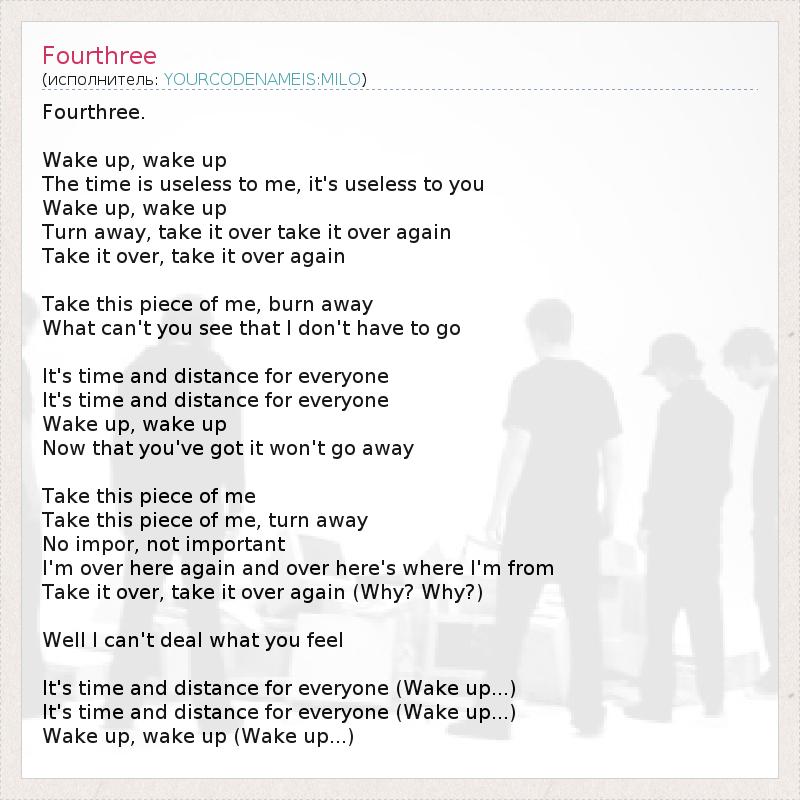 Fourthree. Wake up, wake up The time is useless to me, it's useless to you Wake up, wake up Turn away, take it over take it over again Take it over, take it over again Take this piece of me, burn away What can't you see that I don't have to go It's time and distance for everyone It's time and distance for everyone Wake up, wake up Now that you've got it won't go away Take this piece of me Take this piece of me, turn away No impor, not important I'm over here again and over here's where I'm from Take it over, take it over again (Why? Why?) Well I can't deal what you feel It's time and distance for everyone (Wake up...) It's time and distance for everyone (Wake up...) Wake up, wake up (Wake up...)