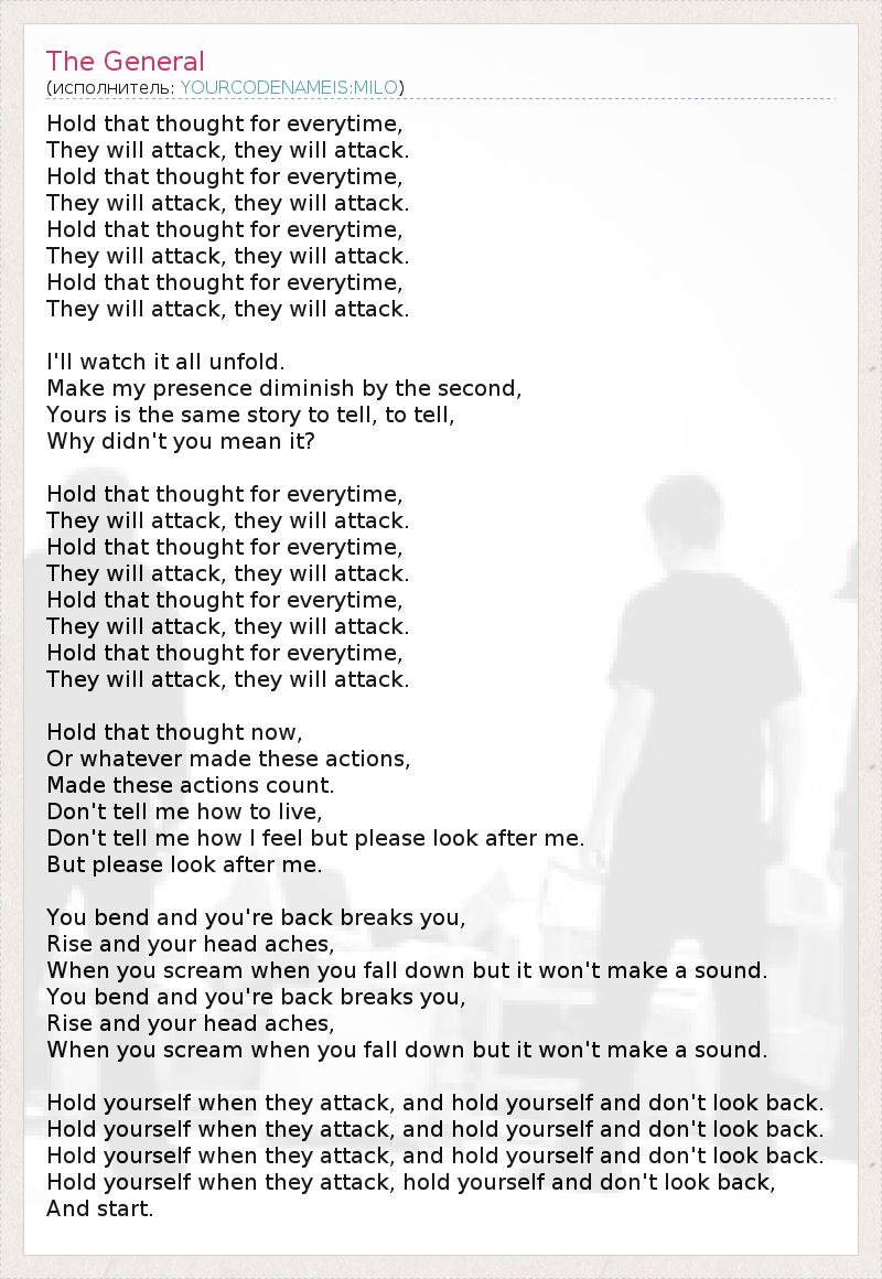 Hold that thought for everytime, They will attack, they will attack. Hold that thought for everytime, They will attack, they will attack. Hold that thought for everytime, They will attack, they will attack. Hold that thought for everytime, They will attack, they will attack. I'll watch it all unfold. Make my presence diminish by the second, Yours is the same story to tell, to tell, Why didn't you mean it? Hold that thought for everytime, They will attack, they will attack. Hold that thought for everytime, They will attack, they will attack. Hold that thought for everytime, They will attack, they will attack. Hold that thought for everytime, They will attack, they will attack. Hold that thought now, Or whatever made these actions, Made these actions count. Don't tell me how to live, Don't tell me how I feel but please look after me. But please look after me. You bend and you're back breaks you, Rise and your head aches, When you scream when you fall down but it won't make a sound. You bend and you're back breaks you, Rise and your head aches, When you scream when you fall down but it won't make a sound. Hold yourself when they attack, and hold yourself and don't look back. Hold yourself when they attack, and hold yourself and don't look back. Hold yourself when they attack, and hold yourself and don't look back. Hold yourself when they attack, hold yourself and don't look back, And start.