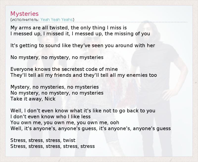 My arms are all twisted, the only thing I miss is I messed up, I missed it, I messed up, the missing of you It's getting to sound like they’ve seen you around with her No mystery, no mystery, no mysteries Everyone knows the secretest code of mine They'll tell all my friends and they'll tell all my enemies too Mystery, no mysteries, no mysteries No mystery, no mystery, no mysteries Take it away, Nick Well, I don't even know what it's like not to go back to you I don't even know who I like less You own me, you own me, you own me, ooh Well, it's anyone's, anyone's guess, it's anyone's, anyone's guess Stress, stress, stress, twist Stress, stress, stress, stress, stress