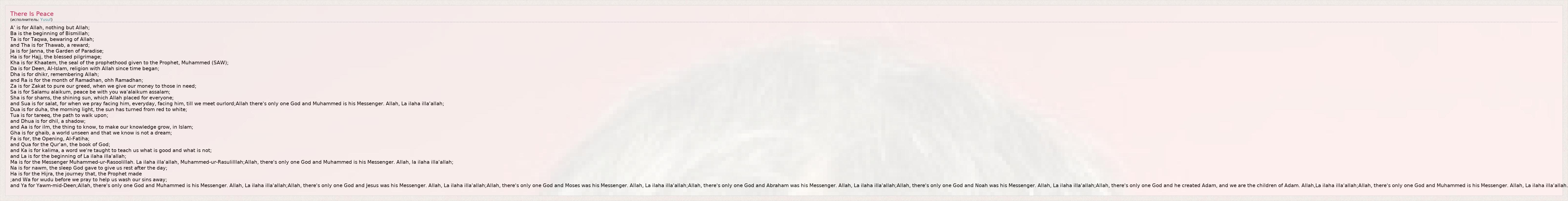 A' is for Allah, nothing but Allah; Ba is the beginning of Bismillah; Ta is for Taqwa, bewaring of Allah; and Tha is for Thawab, a reward; Ja is for Janna, the Garden of Paradise; Ha is for Hajj, the blessed pilgrimage; Kha is for Khaatem, the seal of the prophethood given to the Prophet, Muhammed (SAW); Da is for Deen, Al-Islam, religion with Allah since time began; Dha is for dhikr, remembering Allah; and Ra is for the month of Ramadhan, ohh Ramadhan; Za is for Zakat to pure our greed, when we give our money to those in need; Sa is for Salamu alaikum, peace be with you wa'alaikum assalam; Sha is for shams, the shining sun, which Allah placed for everyone; and Sua is for salat, for when we pray facing him, everyday, facing him, till we meet ourlord;Allah there's only one God and Muhammed is his Messenger. Allah, La ilaha illa'allah; Dua is for duha, the morning light, the sun has turned from red to white; Tua is for tareeq, the path to walk upon; and Dhua is for dhil, a shadow; and Aa is for ilm, the thing to know, to make our knowledge grow, in Islam; Gha is for ghaib, a world unseen and that we know is not a dream; Fa is for, the Opening, Al-Fatiha; and Qua for the Qur'an, the book of God; and Ka is for kalima, a word we're taught to teach us what is good and what is not; and La is for the beginning of La ilaha illa'allah; Ma is for the Messenger Muhammed-ur-Rasoolillah. La ilaha illa'allah, Muhammed-ur-Rasulilllah;Allah, there's only one God and Muhammed is his Messenger. Allah, la ilaha illa'allah; Na is for nawm, the sleep God gave to give us rest after the day; Ha is for the Hijra, the journey that, the Prophet made ;and Wa for wudu before we pray to help us wash our sins away; and Ya for Yawm-mid-Deen;Allah, there's only one God and Muhammed is his Messenger. Allah, La ilaha illa'allah;Allah, there's only one God and Jesus was his Messenger. Allah, La ilaha illa'allah;Allah, there's only one God and Moses was his Messenger. Allah, La ilaha illa'allah;Allah, there's only one God and Abraham was his Messenger. Allah, La ilaha illa'allah;Allah, there's only one God and Noah was his Messenger. Allah, La ilaha illa'allah;Allah, there's only one God and he created Adam, and we are the children of Adam. Allah,La ilaha illa'allah;Allah, there's only one God and Muhammed is his Messenger. Allah, La ilaha illa'allah.