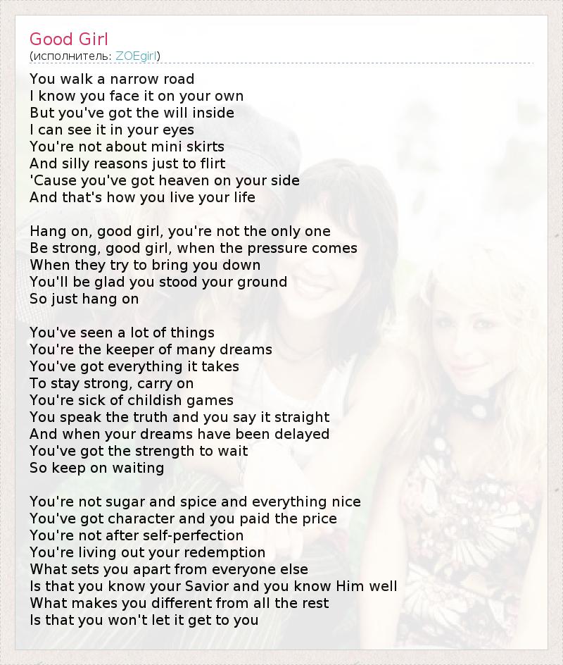 You walk a narrow road I know you face it on your own But you've got the will inside I can see it in your eyes You're not about mini skirts And silly reasons just to flirt 'Cause you've got heaven on your side And that's how you live your life Hang on, good girl, you're not the only one Be strong, good girl, when the pressure comes When they try to bring you down You'll be glad you stood your ground So just hang on You've seen a lot of things You're the keeper of many dreams You've got everything it takes To stay strong, carry on You're sick of childish games You speak the truth and you say it straight And when your dreams have been delayed You've got the strength to wait So keep on waiting You're not sugar and spice and everything nice You've got character and you paid the price You're not after self-perfection You're living out your redemption What sets you apart from everyone else Is that you know your Savior and you know Him well What makes you different from all the rest Is that you won't let it get to you