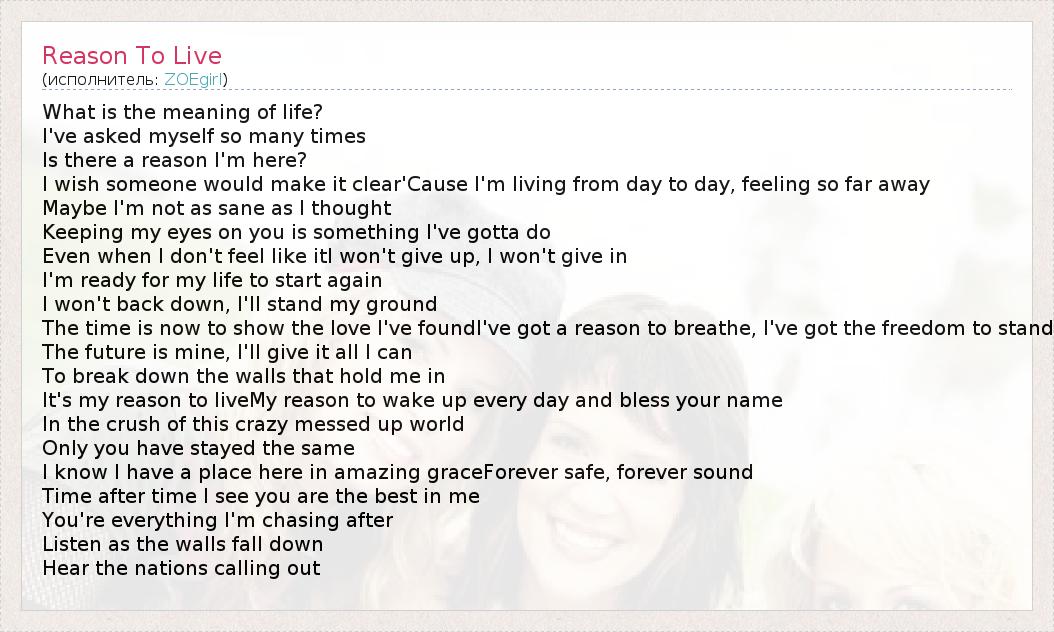 What is the meaning of life? I've asked myself so many times Is there a reason I'm here? I wish someone would make it clear'Cause I'm living from day to day, feeling so far away Maybe I'm not as sane as I thought Keeping my eyes on you is something I've gotta do Even when I don't feel like itI won't give up, I won't give in I'm ready for my life to start again I won't back down, I'll stand my ground The time is now to show the love I've foundI've got a reason to breathe, I've got the freedom to stand The future is mine, I'll give it all I can To break down the walls that hold me in It's my reason to liveMy reason to wake up every day and bless your name In the crush of this crazy messed up world Only you have stayed the same I know I have a place here in amazing graceForever safe, forever sound Time after time I see you are the best in me You're everything I'm chasing after Listen as the walls fall down Hear the nations calling out