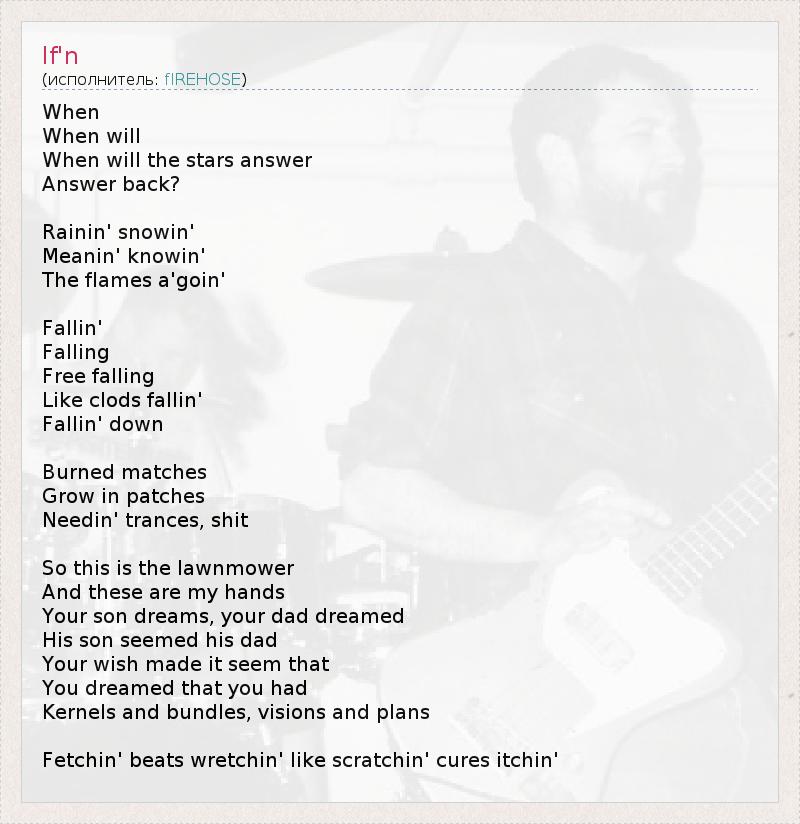 When When will When will the stars answer Answer back? Rainin' snowin' Meanin' knowin' The flames a'goin' Fallin' Falling Free falling Like clods fallin' Fallin' down Burned matches Grow in patches Needin' trances, shit So this is the lawnmower And these are my hands Your son dreams, your dad dreamed His son seemed his dad Your wish made it seem that You dreamed that you had Kernels and bundles, visions and plans Fetchin' beats wretchin' like scratchin' cures itchin'