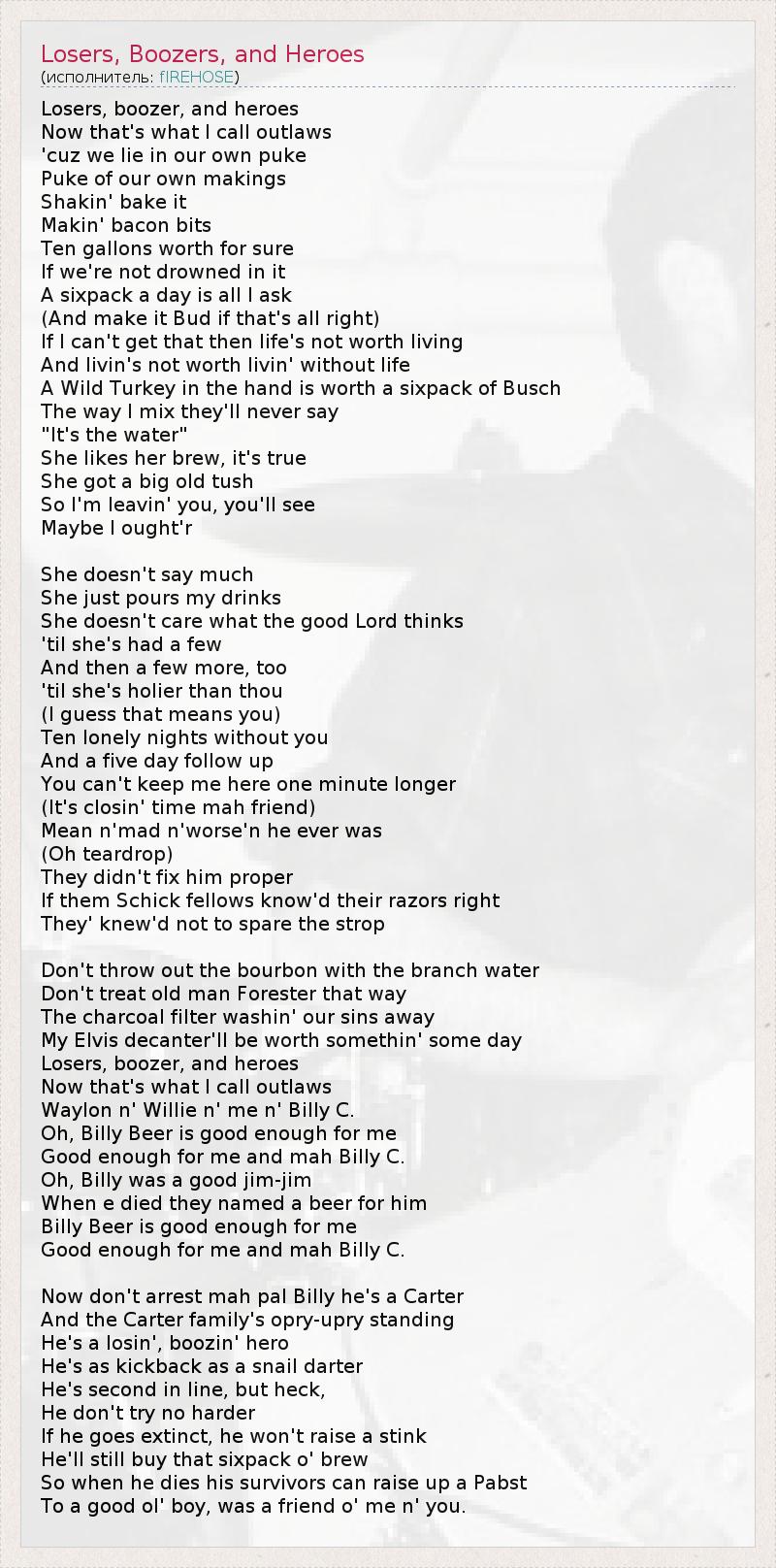 А как ты думаешь, о чем песня "Losers, Boozers, and Heroes" ?