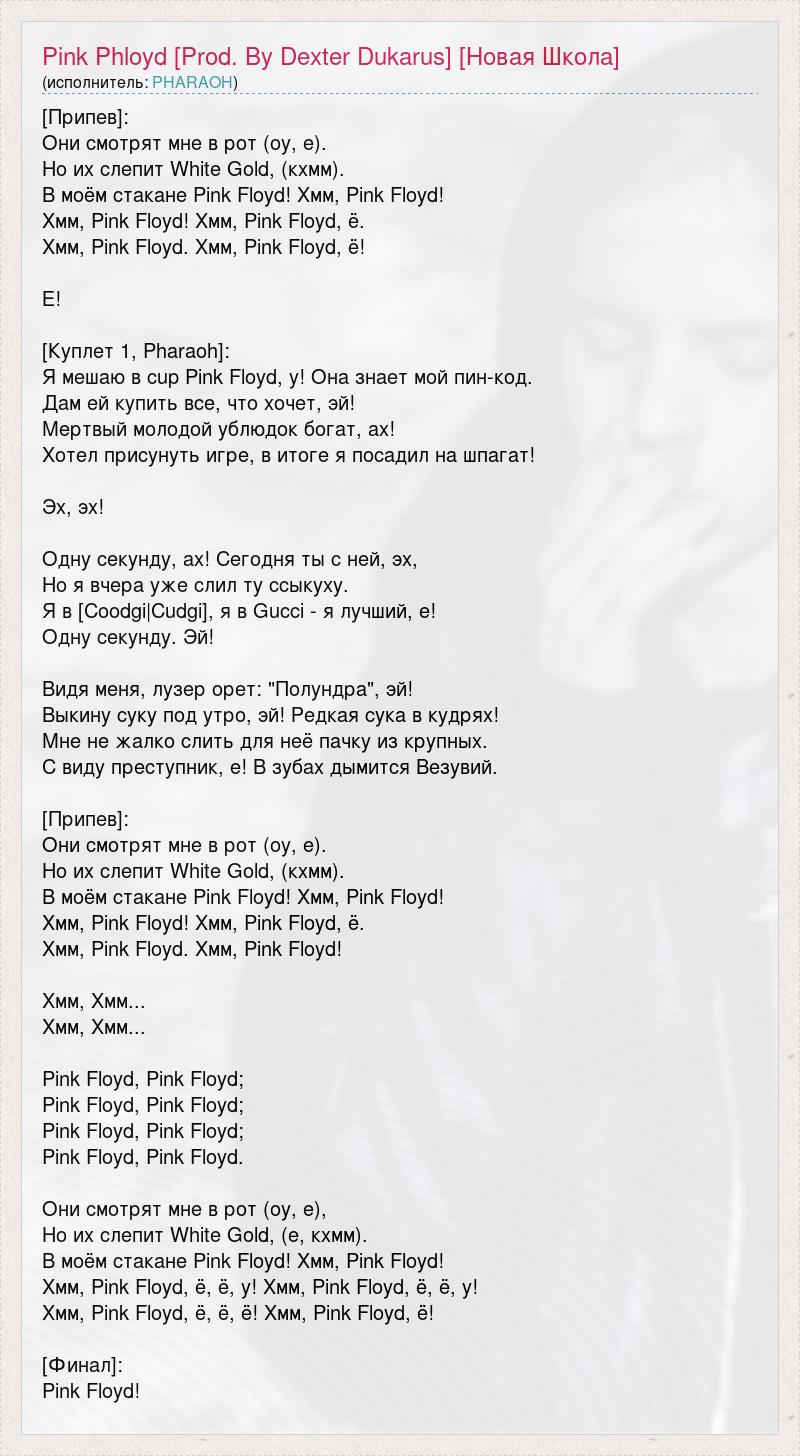 [Припев]: Они смотрят мне в рот (оу, е). Но их слепит White Gold, (кхмм). В моём стакане Pink Floyd! Хмм, Pink Floyd! Хмм, Pink Floyd! Хмм, Pink Floyd, ё. Хмм, Pink Floyd. Хмм, Pink Floyd, ё! Е! [Куплет 1, Pharaoh]: Я мешаю в cup Pink Floyd, у! Она знает мой пин-код. Дам ей купить все, что хочет, эй! Мертвый молодой ублюдок богат, ах! Хотел присунуть игре, в итоге я посадил на шпагат! Эх, эх! Одну секунду, ах! Сегодня ты с ней, эх, Но я вчера уже слил ту ссыкуху. Я в [Coodgi|Cudgi], я в Gucci - я лучший, е! Одну секунду. Эй! Видя меня, лузер орет: "Полундра", эй! Выкину суку под утро, эй! Редкая сука в кудрях! Мне не жалко слить для неё пачку из крупных. С виду преступник, е! В зубах дымится Везувий. [Припев]: Они смотрят мне в рот (оу, е). Но их слепит White Gold, (кхмм). В моём стакане Pink Floyd! Хмм, Pink Floyd! Хмм, Pink Floyd! Хмм, Pink Floyd, ё. Хмм, Pink Floyd. Хмм, Pink Floyd! Хмм, Хмм... Хмм, Хмм... Pink Floyd, Pink Floyd; Pink Floyd, Pink Floyd; Pink Floyd, Pink Floyd; Pink Floyd, Pink Floyd. Они смотрят мне в рот (оу, е), Но их слепит White Gold, (е, кхмм). В моём стакане Pink Floyd! Хмм, Pink Floyd! Хмм, Pink Floyd, ё, ё, у! Хмм, Pink Floyd, ё, ё, у! Хмм, Pink Floyd, ё, ё, ё! Хмм, Pink Floyd, ё! [Финал]: Pink Floyd!