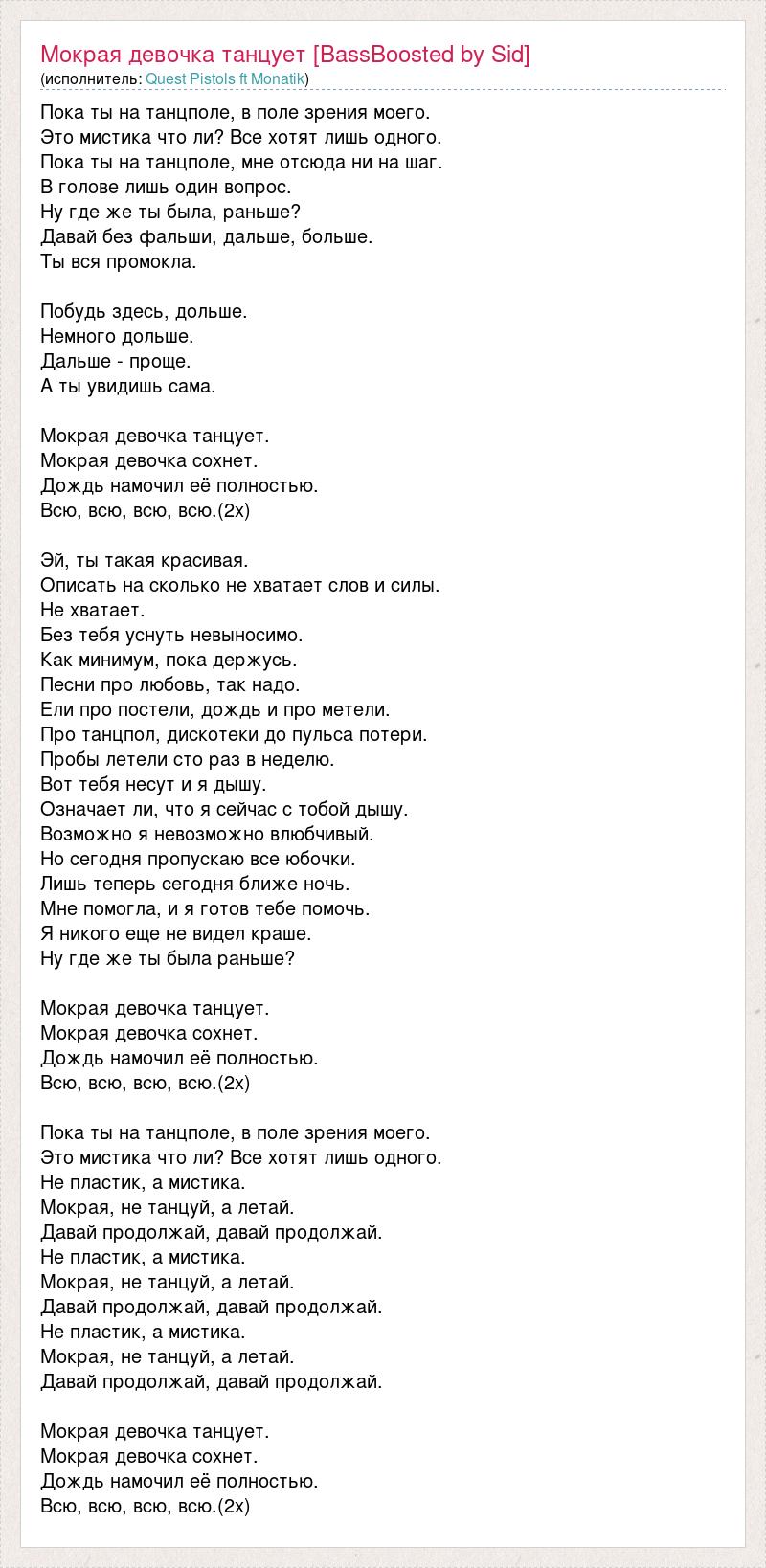 Пока ты на танцполе, в поле зрения моего. Это мистика что ли? Все хотят лишь одного. Пока ты на танцполе, мне отсюда ни на шаг. В голове лишь один вопрос. Ну где же ты была, раньше? Давай без фальши, дальше, больше. Ты вся промокла. Побудь здесь, дольше. Немного дольше. Дальше - проще. А ты увидишь сама. Мокрая девочка танцует. Мокрая девочка сохнет. Дождь намочил её полностью. Всю, всю, всю, всю.(2х) Эй, ты такая красивая. Описать на сколько не хватает слов и силы. Не хватает. Без тебя уснуть невыносимо. Как минимум, пока держусь. Песни про любовь, так надо. Ели про постели, дождь и про метели. Про танцпол, дискотеки до пульса потери. Пробы летели сто раз в неделю. Вот тебя несут и я дышу. Означает ли, что я сейчас с тобой дышу. Возможно я невозможно влюбчивый. Но сегодня пропускаю все юбочки. Лишь теперь сегодня ближе ночь. Мне помогла, и я готов тебе помочь. Я никого еще не видел краше. Ну где же ты была раньше? Мокрая девочка танцует. Мокрая девочка сохнет. Дождь намочил её полностью. Всю, всю, всю, всю.(2х) Пока ты на танцполе, в поле зрения моего. Это мистика что ли? Все хотят лишь одного. Не пластик, а мистика. Мокрая, не танцуй, а летай. Давай продолжай, давай продолжай. Не пластик, а мистика. Мокрая, не танцуй, а летай. Давай продолжай, давай продолжай. Не пластик, а мистика. Мокрая, не танцуй, а летай. Давай продолжай, давай продолжай. Мокрая девочка танцует. Мокрая девочка сохнет. Дождь намочил её полностью. Всю, всю, всю, всю.(2х)
