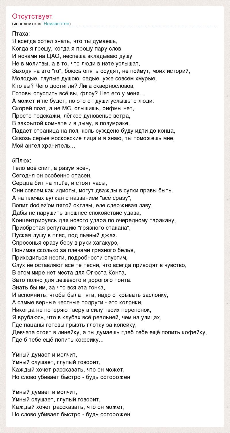 Птаха: Я всегда хотел знать, что ты думаешь, Когда я грешу, когда я прошу пару слов И ночами на ЦАО, неспеша вкладываю душу Не в молитвы, а в то, что люди в нэте услышат, Заходя на это "ru", боюсь опять осудят, не поймут, моих историй, Молодые, глупые душою, седые, уже совсем хмурые, Кто вы? Чего достигли? Лига сквернословов, Готовы опустить всё вы, флоу? Нет его у меня... А может и не будет, но это от души услышьте люди. Скорей поэт, а не МС, слышишь, рифмы нет, Просто подскажи, лёгкое дуновенье ветра, В закрытой комнате и в дыму, в полумраке, Падает страница на пол, коль суждено буду идти до конца, Сквозь серые московские лица и я знаю, ты поможешь мне, Мой ангел хранитель... 5Плюх: Тело моё спит, а разум ясен, Сегодня он особенно опасен, Сердца бит на mut'е, и стоят часы, Они совсем как идиоты, могут дважды в сутки правы быть. А на плечах вулкан с названием "всё сразу", Вопит dodiez'ом пятой октавы, еле сдерживая лаву, Дабы не нарушить внешнее спокойствие удава, Концентрируясь для нового удара по очередному таракану, Приобретая репутацию "грязного стакана", Пуская душу в пляс, под пьяный джаз. Спросонья сразу беру в руки хагакурэ, Понимая сколько за плечами грязного белья, Приходиться нести, подробности опустим, Слух не оставляют все те песни, что всегда приводят в чувство, В этом мире нет места для Огюста Конта, Зато полно для дешёвого и дорогого понта. Знать бы им, за что вся эта гонка, И вспомнить: чтобы была тяга, надо открывать заслонку, А самые верные честные подруги - это колонки, Никогда не потеряют веру в силу твоих перепонок, Я врубаюсь, что в клубах всё реальней, чем на улицах, Где пацаны готовы грызть глотку за копейку, Девчата стоят в линейку, а ты думаешь гдеб тебе ещё попить кофейку, Где б тебе ещё попить кофейку... Умный думает и молчит, Умный слушает, глупый говорит, Каждый хочет рассказать, что он может, Но слово убивает быстро - будь осторожен Умный думает и молчит, Умный слушает, глупый говорит, Каждый хочет рассказать, что он может, Но слово убивает быстро - будь осторожен