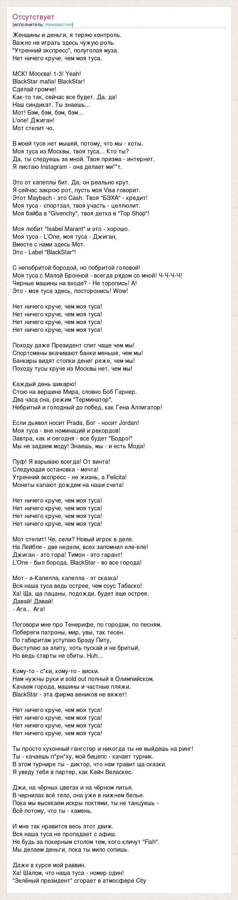 Женщины и деньги, я теряю контроль. Важно не играть здесь чужую роль. "Утренний экспресс", полуголая муза. Нет ничего круче, чем моя туса. МСК! Москва! 1-3! Yeah! BlackStar mafia! BlackStar! Сделай громче! Как-то так, сейчас все будет. Да, да! Наш синдикат. Ты знаешь... Мот! Бэм, бэм, бэм, бэм... L'one! Джиган! Мот стелит чо. В моей тусе нет мышей, потому, что мы - коты. Моя туса из Москвы, твоя туса... Кто ты? Да, ты следуешь за мной. Твоя призма - интернет. Я листаю Instagram - она делает ми**т. Это от капеллы бит. Да, он реально крут. Я сейчас закрою рот, пусть моя Visa говорит. Этот Maybach - это Cash. Твоя "БЭХА" - кредит! Моя туса - спортзал, твоя участь - целлюлит. Моя бэйба в "Givenchy", твоя детка в "Top Shop"! Моя любит "Isabel Marant" и это - хорошо. Моя туса - L’One, моя туса - Джиган, Вместе с нами здесь Мот. Это - Label "BlackStar"! С непобритой бородой, но побритой головой! Моя туса с Малой Бронной - всегда рядом со мной! Ч-Ч-Ч-Ч! Черные машины на входе? - Не торопись! А! Это - моя туса здесь, посторонись! Wow! Нет ничего круче, чем моя туса! Нет ничего круче, чем моя туса! Нет ничего круче, чем моя туса! Нет ничего круче, чем моя туса! Походу даже Президент спит чаще чем мы! Спортсмены вкачивают банки меньше, чем мы! Банкиры видят стопки денег реже, чем мы! Походу тусы круче из Москвы нет, чем мы! Каждый день шикарю! Стою на вершине Мира, словно Боб Гарнер. Два часа сна, режим "Терминатор". Небритый и голодный до побед, как Гена Аллигатор! Если дьявол носит Prada, Бог - носит Jordan! Моя туса - вне номинаций и рекордов! Завтра, как и сегодня - все будет "Бодро!" Мы не задаем моду! Знаешь, мы - и есть Мода! Пуф! Я взрываю всегда! От винта! Следующая остановка - мечта! Утренний экспресс - не жизнь, а Felicita! Монеты капают дождем на наши счета! Нет ничего круче, чем моя туса! Нет ничего круче, чем моя туса! Нет ничего круче, чем моя туса! Нет ничего круче, чем моя туса! Мот стелит! Че, сели? Новый игрок в деле. На Лейбле - две недели, всех запомнил еле-еле! Джиган - это гора! Тимон - это гарант! L’One - был борода. BlackStar - во все города! Мот - а-Капелла, капелла - эт сказка! Вся наша туса ведь острее, чем соус Табаско! Ха! Ща, ща пацаны, подожди, будет еще острее. Давай! Давай! - Ага... Ага! Поговори мне про Тенерифе, по городам, по песням. Побереги патроны, мир, увы, так тесен. По габаритам уступаю Брэду Питу, Выступаю за элиту, хоть пускай и не бритый, Но ведь старты не сбиты. Huh... Кому-то - с*ки, кому-то - виски. Нам нужны руки и sold out полный в Олимпийском. Качаем города, машины и частные пляжи. BlackStar - эта фирма веников не вяжет! Нет ничего круче, чем моя туса! Нет ничего круче, чем моя туса! Нет ничего круче, чем моя туса! Нет ничего круче, чем моя туса! Ты просто кухонный гангстер и никогда ты не выйдешь на ринг! Ты - качаешь п*рн*ху, мой бицепс - качает турник. В этом турнире ты - диктор, что нам травит ща сказки. Я уведу тебя в партер, как Кейн Веласкес. Джи, на чёрных цветах и на чёрном литье. В чернилах всё тело, она уже в нижнем белье. Пока мы высекаем искры локтями, ты не танцуешь - Всё потому, что ты - камень. И мне так нравится весь этот движ. Вся наша туса не пропадает с афиш. Не будь за покерным столом тем, кого кличут "Fish". Мы делаем деньги, пока ты мило сопишь. Даже в курсе мой раввин. Ха! Шалом, что наша туса - номер один! "Зелёный президент" сгорает в атмосфере City