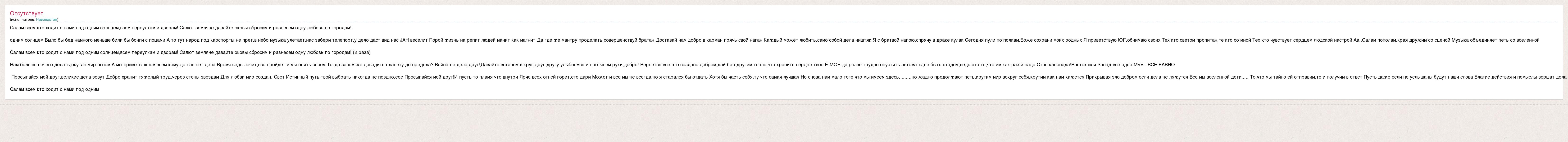 Главная→Исполнители→Неизвестен→Салам всем кто ходит с нами под одним солнцем,всем переулкам и дворам! Салют