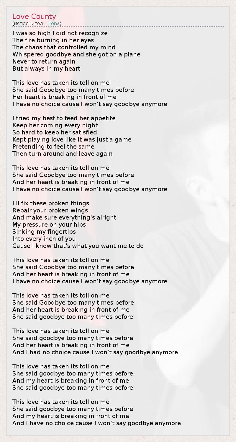 I was so high I did not recognize The fire burning in her eyes The chaos that controlled my mind Whispered goodbye and she got on a plane Never to return again But always in my heart This love has taken its toll on me She said Goodbye too many times before Her heart is breaking in front of me I have no choice cause I won't say goodbye anymore I tried my best to feed her appetite Keep her coming every night So hard to keep her satisfied Kept playing love like it was just a game Pretending to feel the same Then turn around and leave again This love has taken its toll on me She said Goodbye too many times before And her heart is breaking in front of me I have no choice cause I won't say goodbye anymore I'll fix these broken things Repair your broken wings And make sure everything's alright My pressure on your hips Sinking my fingertips Into every inch of you Cause I know that's what you want me to do This love has taken its toll on me She said Goodbye too many times before And her heart is breaking in front of me I have no choice cause I won't say goodbye anymore This love has taken its toll on me She said Goodbye too many times before And her heart is breaking in front of me She said goodbye too many times before This love has taken its toll on me She said goodbye too many times before And her heart is breaking in front of me And I had no choice cause I won't say goodbye anymore This love has taken its toll on me She said goodbye too many times before And my heart is breaking in front of me She said goodbye too many times before This love has taken its toll on me She said goodbye too many times before And my heart is breaking in front of me And I have no choice cause I won't say goodbye anymore