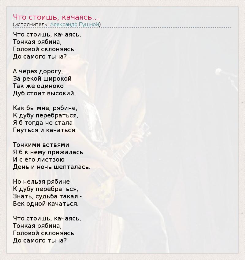 А как ты думаешь, о чем песня "Что стоишь, качаясь..." ?