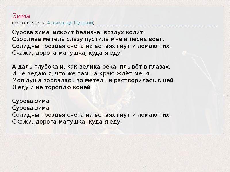 Сурова зима, искрит белизна, воздух колит. Озорлива метель слезу пустила мне и песнь воет. Солидны гроздья снега на ветвях гнут и ломают их. Скажи, дорога-матушка, куда я еду. А даль глубока и, как велика река, плывёт в глазах. И не ведаю я, что же там на краю ждёт меня. Моя душа ворвалась во метель и растворилась в ней. Я еду и не тороплю коней. Сурова зима Сурова зима Солидны гроздья снега на ветвях гнут и ломают их. Скажи, дорога-матушка, куда я еду.