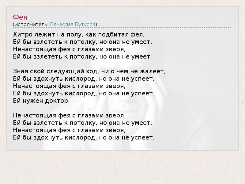 Хитро лежит на полу, как подбитая фея. Ей бы взлететь к потолку, но она не умеет. Ненастоящая фея с глазами зверя, Ей бы взлететь к потолку, но она не умеет Зная свой следующий ход, ни о чем не жалеет, Ей бы вдохнуть кислород, но она не успеет. Ненастоящая фея с глазами зверя, Ей бы вдохнуть кислород, но она не успеет. Ей нужен доктор. Ненастоящая фея с глазами зверя Ей бы взлететь к потолку, но она не умеет. Ненастоящая фея с глазами зверя, Ей бы вдохнуть кислород, но она не успеет.