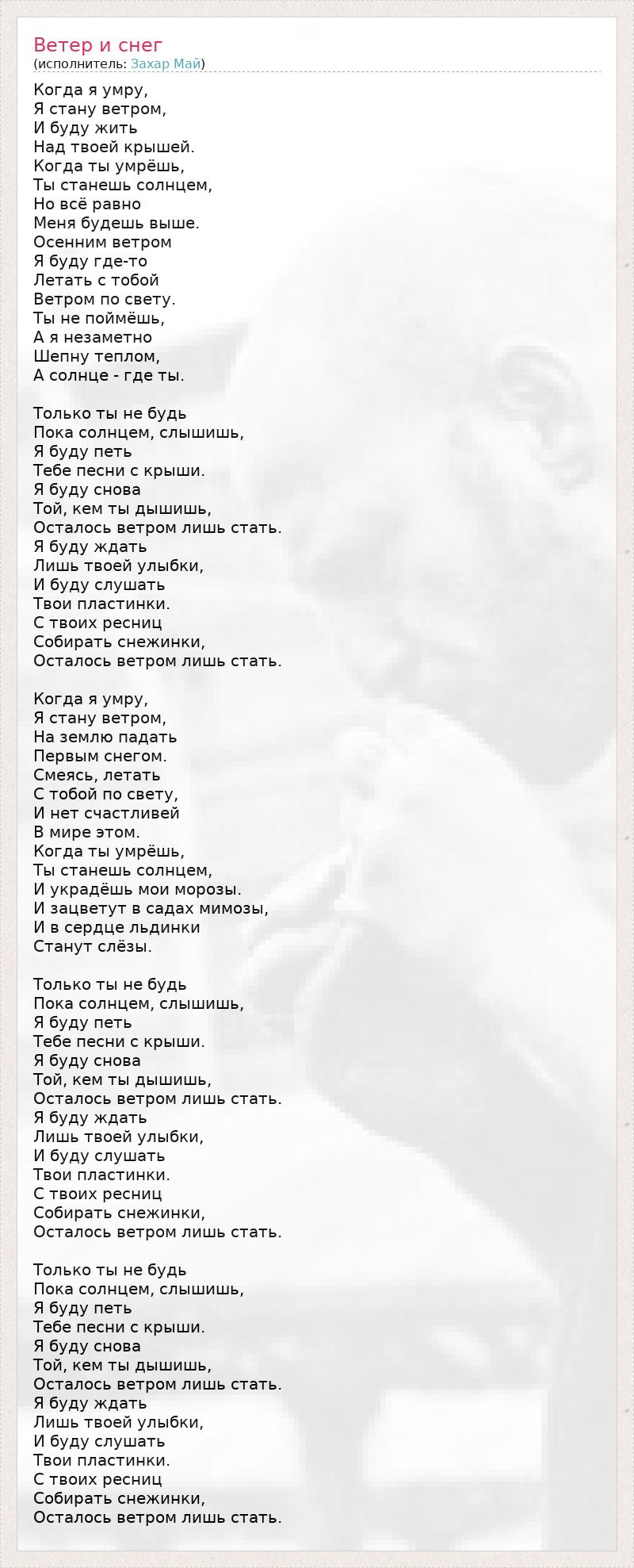 Когда я умру, Я стану ветром, И буду жить Над твоей крышей. Когда ты умрёшь, Ты станешь солнцем, Но всё равно Меня будешь выше. Осенним ветром Я буду где-то Летать с тобой Ветром по свету. Ты не поймёшь, А я незаметно Шепну теплом, А солнце - где ты. Только ты не будь Пока солнцем, слышишь, Я буду петь Тебе песни с крыши. Я буду снова Той, кем ты дышишь, Осталось ветром лишь стать. Я буду ждать Лишь твоей улыбки, И буду слушать Твои пластинки. С твоих ресниц Собирать снежинки, Осталось ветром лишь стать. Когда я умру, Я стану ветром, На землю падать Первым снегом. Смеясь, летать С тобой по свету, И нет счастливей В мире этом. Когда ты умрёшь, Ты станешь солнцем, И украдёшь мои морозы. И зацветут в садах мимозы, И в сердце льдинки Станут слёзы. Только ты не будь Пока солнцем, слышишь, Я буду петь Тебе песни с крыши. Я буду снова Той, кем ты дышишь, Осталось ветром лишь стать. Я буду ждать Лишь твоей улыбки, И буду слушать Твои пластинки. С твоих ресниц Собирать снежинки, Осталось ветром лишь стать. Только ты не будь Пока солнцем, слышишь, Я буду петь Тебе песни с крыши. Я буду снова Той, кем ты дышишь, Осталось ветром лишь стать. Я буду ждать Лишь твоей улыбки, И буду слушать Твои пластинки. С твоих ресниц Собирать снежинки, Осталось ветром лишь стать.