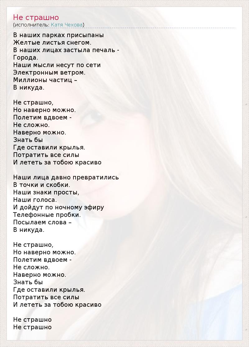 В наших парках присыпаны Желтые листья снегом. В наших лицах застыла печаль - Города. Наши мысли несут по сети Электронным ветром. Миллионы частиц – В никуда. Не страшно, Но наверно можно. Полетим вдвоем - Не сложно. Наверно можно. Знать бы Где оставили крылья. Потратить все силы И лететь за тобою красиво Наши лица давно превратились В точки и скобки. Наши знаки просты, Наши голоса. И дойдут по ночному эфиру Телефонные пробки. Посылаем слова – В никуда. Не страшно, Но наверно можно. Полетим вдвоем - Не сложно. Наверно можно. Знать бы Где оставили крылья. Потратить все силы И лететь за тобою красиво Не страшно Не страшно