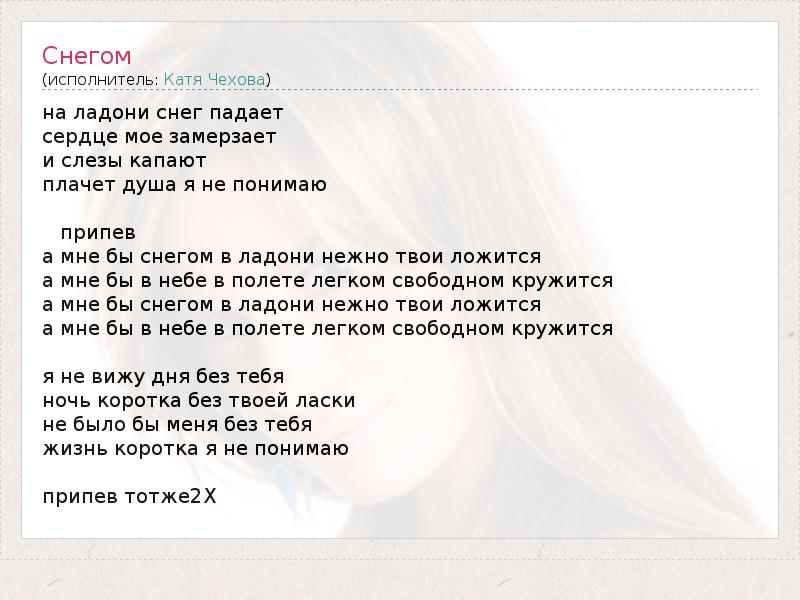 на ладони снег падает сердце мое замерзает и слезы капают плачет душа я не понимаю припев а мне бы снегом в ладони нежно твои ложится а мне бы в небе в полете легком свободном кружится а мне бы снегом в ладони нежно твои ложится а мне бы в небе в полете легком свободном кружится я не вижу дня без тебя ночь коротка без твоей ласки не было бы меня без тебя жизнь коротка я не понимаю припев тотже2Х