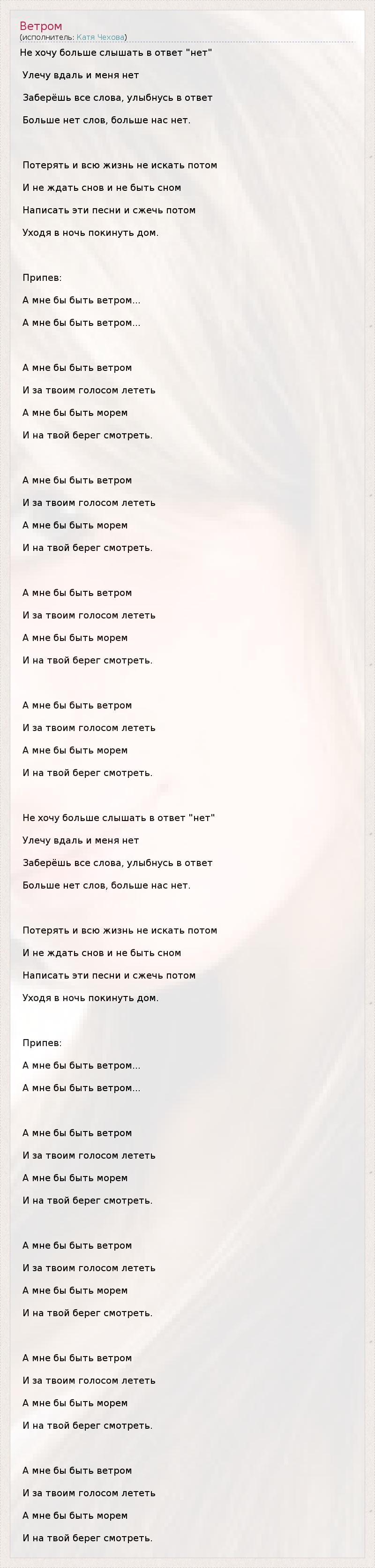 Не хочу больше слышать в ответ "нет" Улечу вдаль и меня нет Заберёшь все слова, улыбнусь в ответ Больше нет слов, больше нас нет. Потерять и всю жизнь не искать потом И не ждать снов и не быть сном Написать эти песни и сжечь потом Уходя в ночь покинуть дом. Припев: А мне бы быть ветром... А мне бы быть ветром... А мне бы быть ветром И за твоим голосом лететь А мне бы быть морем И на твой берег смотреть. А мне бы быть ветром И за твоим голосом лететь А мне бы быть морем И на твой берег смотреть. А мне бы быть ветром И за твоим голосом лететь А мне бы быть морем И на твой берег смотреть. А мне бы быть ветром И за твоим голосом лететь А мне бы быть морем И на твой берег смотреть. Не хочу больше слышать в ответ "нет" Улечу вдаль и меня нет Заберёшь все слова, улыбнусь в ответ Больше нет слов, больше нас нет. Потерять и всю жизнь не искать потом И не ждать снов и не быть сном Написать эти песни и сжечь потом Уходя в ночь покинуть дом. Припев: А мне бы быть ветром... А мне бы быть ветром... А мне бы быть ветром И за твоим голосом лететь А мне бы быть морем И на твой берег смотреть. А мне бы быть ветром И за твоим голосом лететь А мне бы быть морем И на твой берег смотреть. А мне бы быть ветром И за твоим голосом лететь А мне бы быть морем И на твой берег смотреть. А мне бы быть ветром И за твоим голосом лететь А мне бы быть морем И на твой берег смотреть.