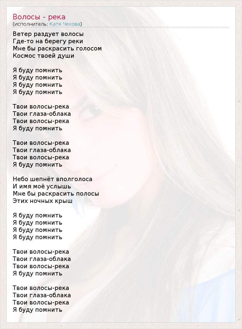 Ветер раздует волосы Где-то на берегу реки Мне бы раскрасить голосом Космос твоей души Я буду помнить Я буду помнить Я буду помнить Я буду помнить Твои волосы-река Твои глаза-облака Твои волосы-река Я буду помнить Твои волосы-река Твои глаза-облака Твои волосы-река Я буду помнить Небо шепнёт вполголоса И имя моё услышь Мне бы раскрасить полосы Этих ночных крыш Я буду помнить Я буду помнить Я буду помнить Я буду помнить Твои волосы-река Твои глаза-облака Твои волосы-река Я буду помнить Твои волосы-река Твои глаза-облака Твои волосы-река Я буду помнить